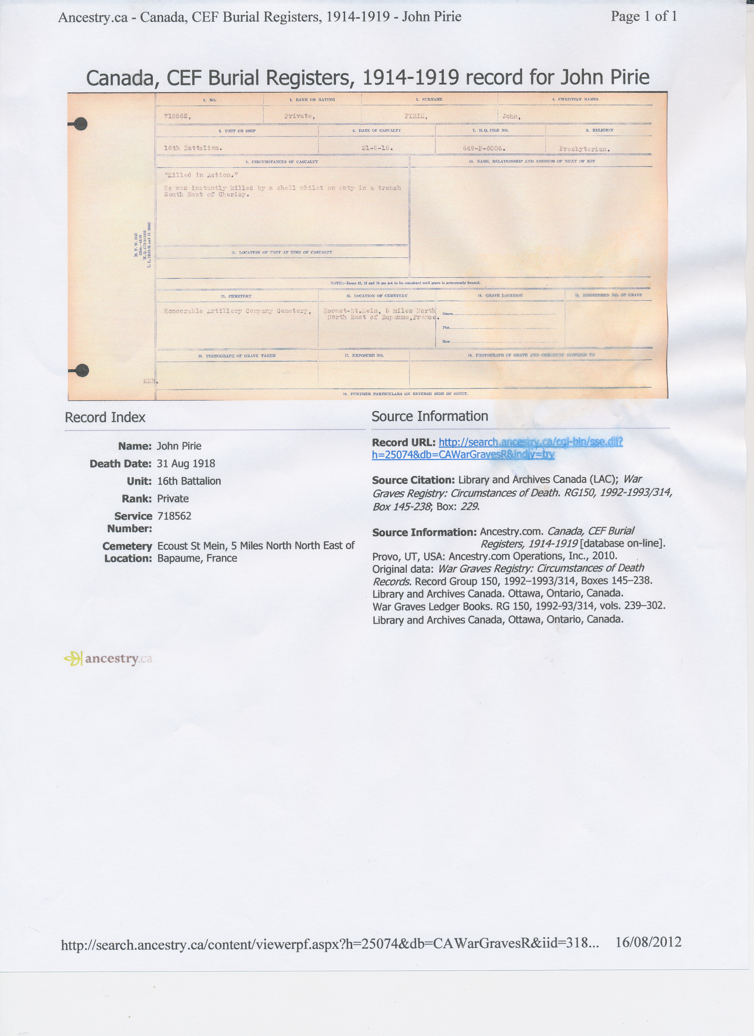 Object Desc Graves registration, Family tree, Buriel Register, Killed in Action Report re: John Pirie WW1