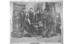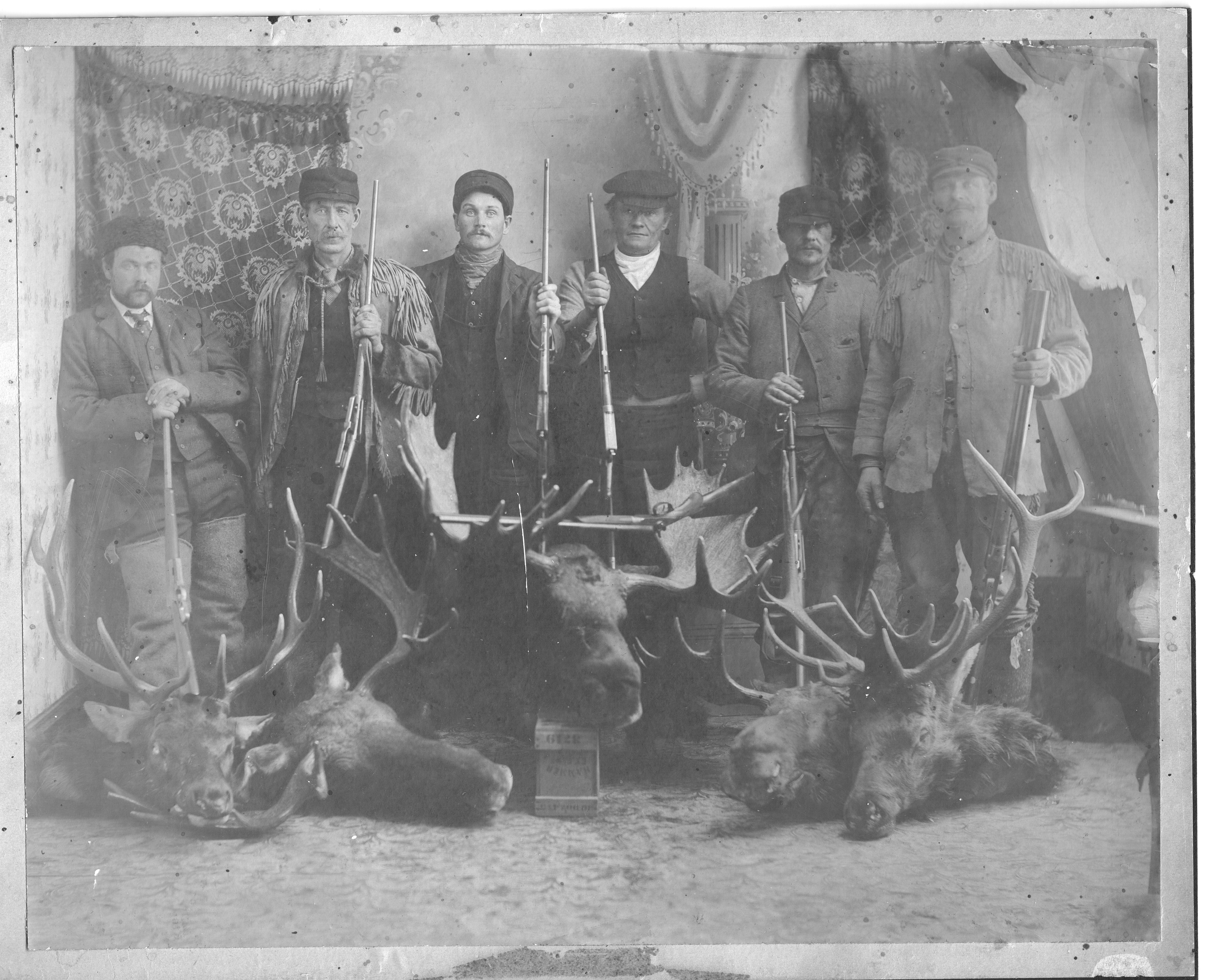 Object Desc Six Moose Hunters. Names unknown. 4th & 5th from left Dunbar Dalgarno and Jack Newsom