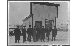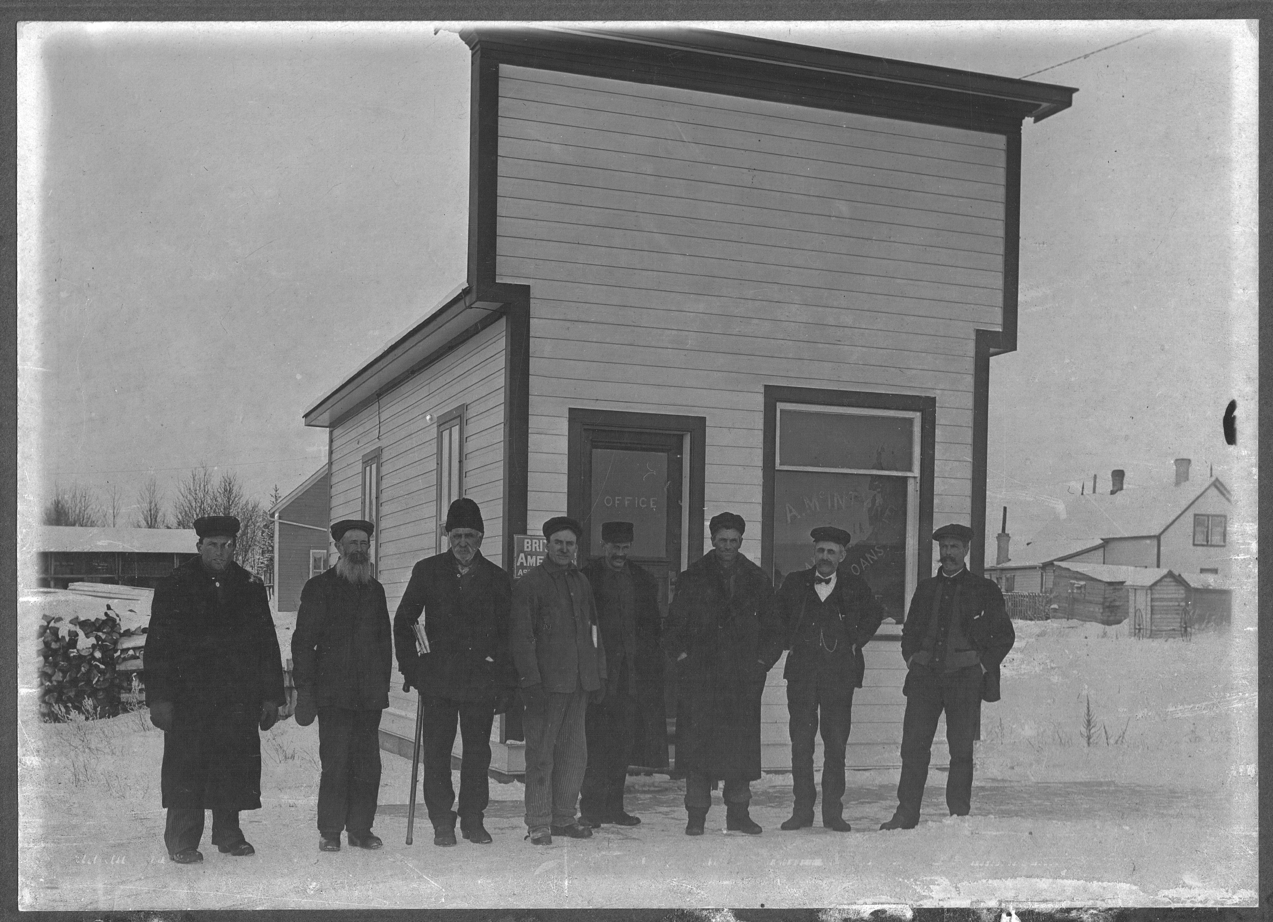 Description Pioneers standing in front of Archie McIntyre's office. L-R: Albert Wahl, Peter McIntyre, Bill Hunter, Malcolm McDonald, Herb McFadden, Abe Baldrow, ARchie McIntyre, Robert Martin
