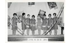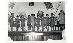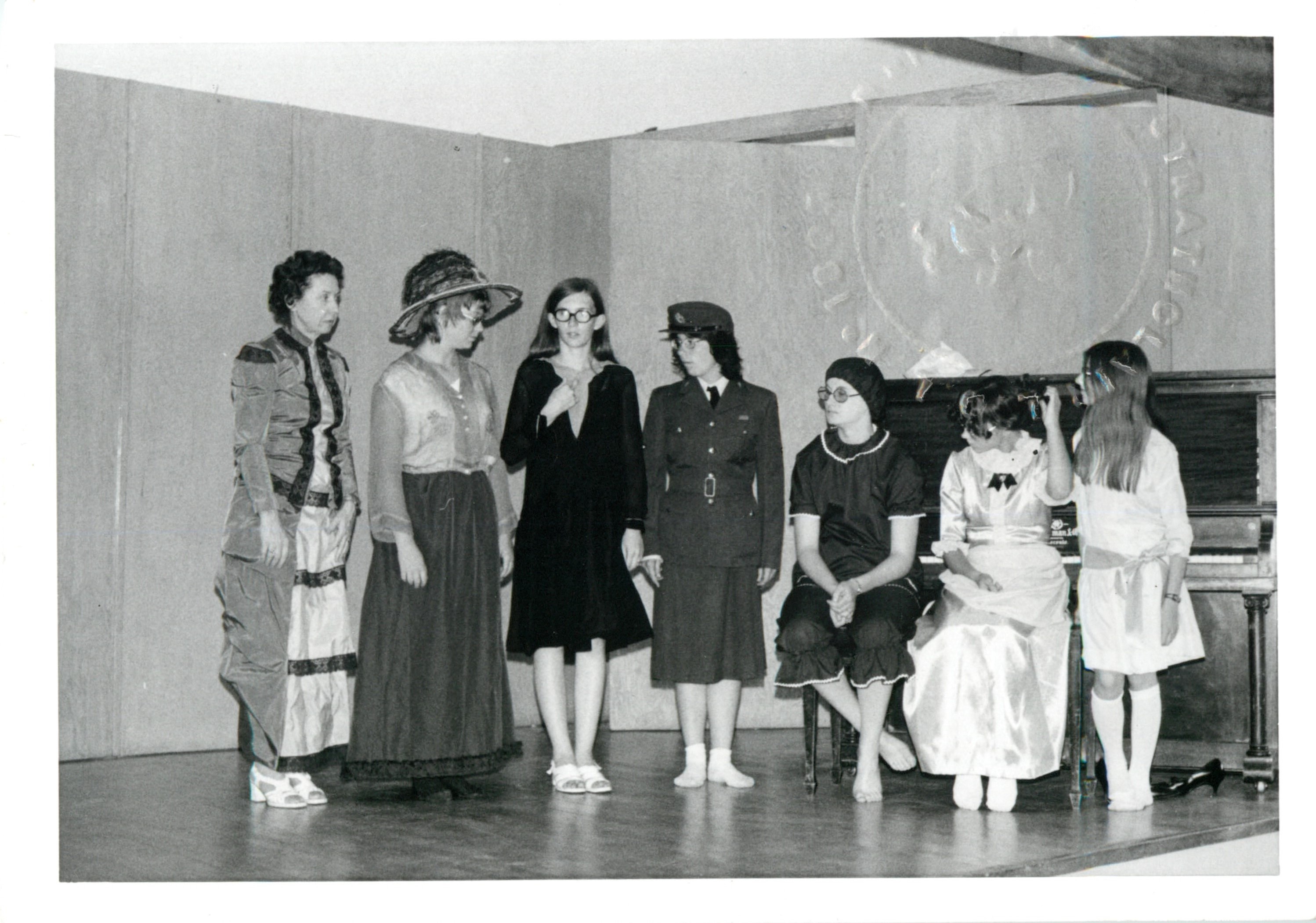 Description L-R Unknown, Debbie (Wareham) Moffat, Janet (Zahaiko) Martin, Kathy (Osborne) Cluett, Bev (Hake) Walinga, Mary Anne Hnatuik, Unknown, Shirely Mae Kingdon, Audrey Prokopchuk, Pat Graham on piano, Hazel Westaway presenting