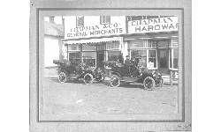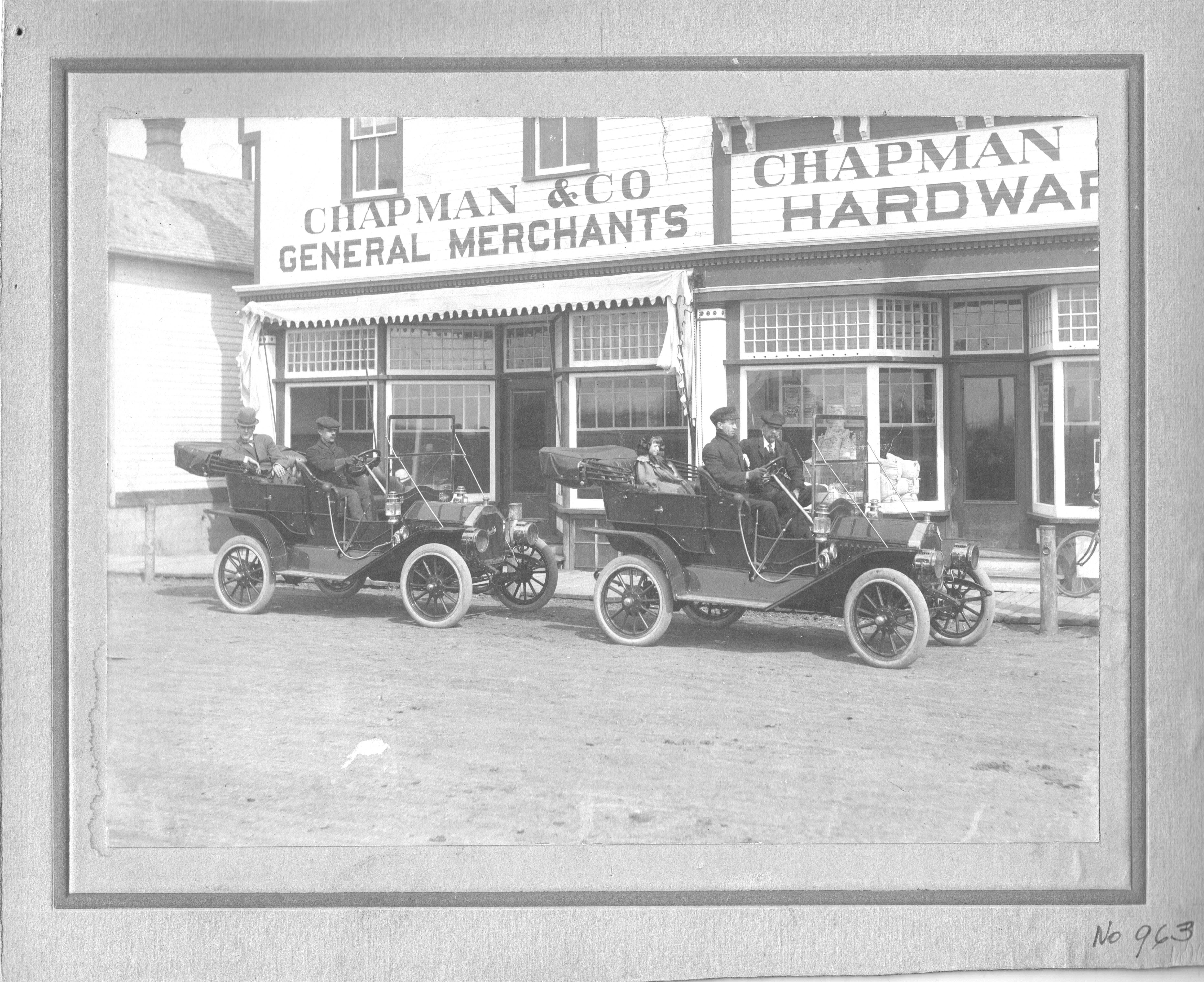 Description Chapman's Merchants and Hardware. 1909 Left car. Martin S (Mark?)Chapman driving, Mr Hollis, Jean Chapman (back seat) Right car Jack Green driving, Forest Chapman