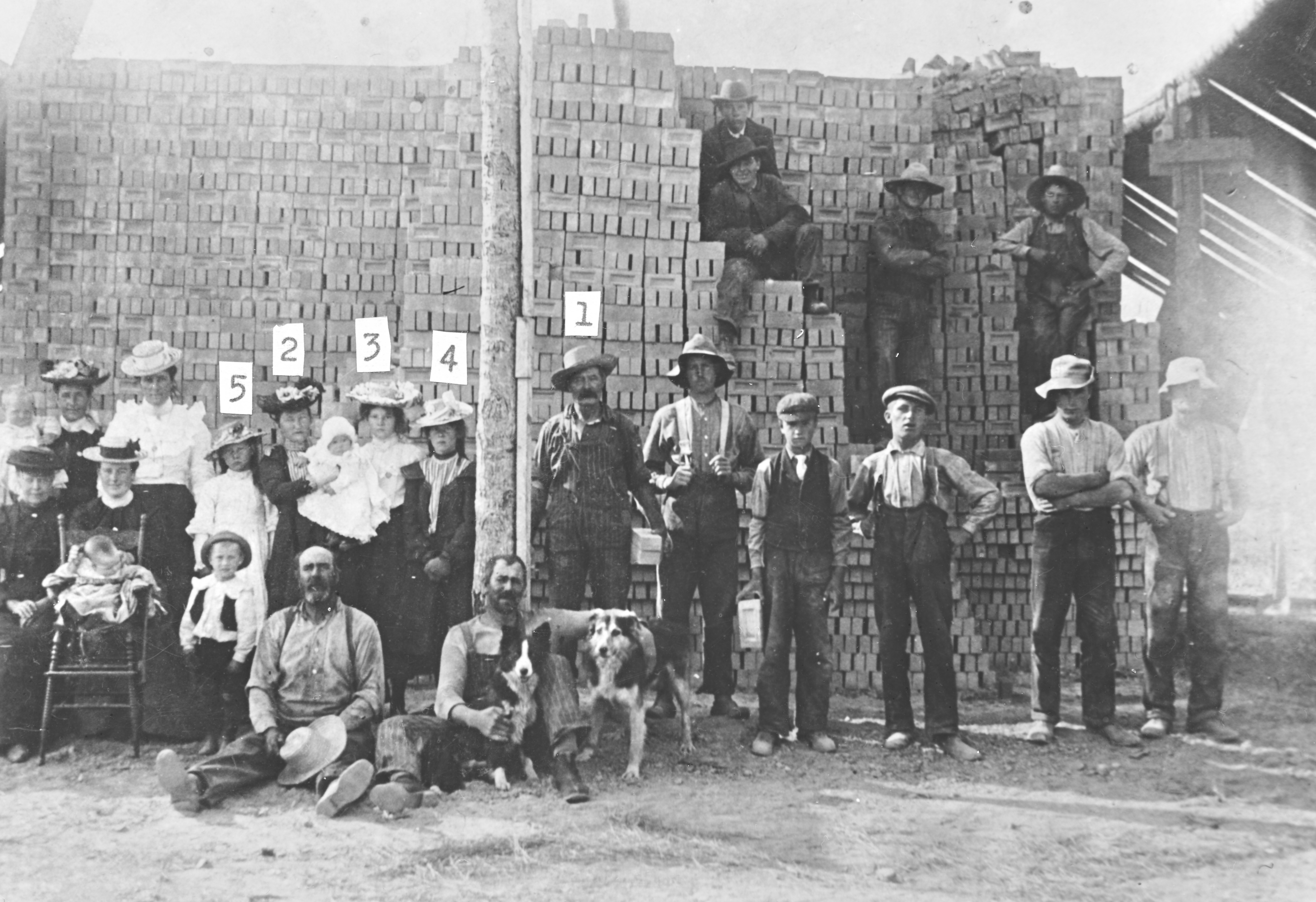 Object Desc Brick Factory 1904. L-R: #5 Ada Bull, #2 Mrs George Bull holding son Edward, #3 Alice Bull, #4 Elva Bull, #1 George Bull, Foreman and brickmaker. Seated on the ground Bob & Joe Partridge, owners; The clay to make the bricks came from the pit SE6-16-21W in