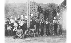 Description Brick Factory 1904. L-R: #5 Ada Bull, #2 Mrs George Bull holding son Edward, #3 Alice Bull, #4 Elva Bull, #1 George Bull, Foreman and brickmaker. Seated on the ground Bob & Joe Partridge, owners; The clay to make the bricks came from the pit SE6-16-21W in the RM of Strathclair, 2 miles north of Marnie Church and School site, with the kiln in the same area (Note: glow from furnace on the right)
