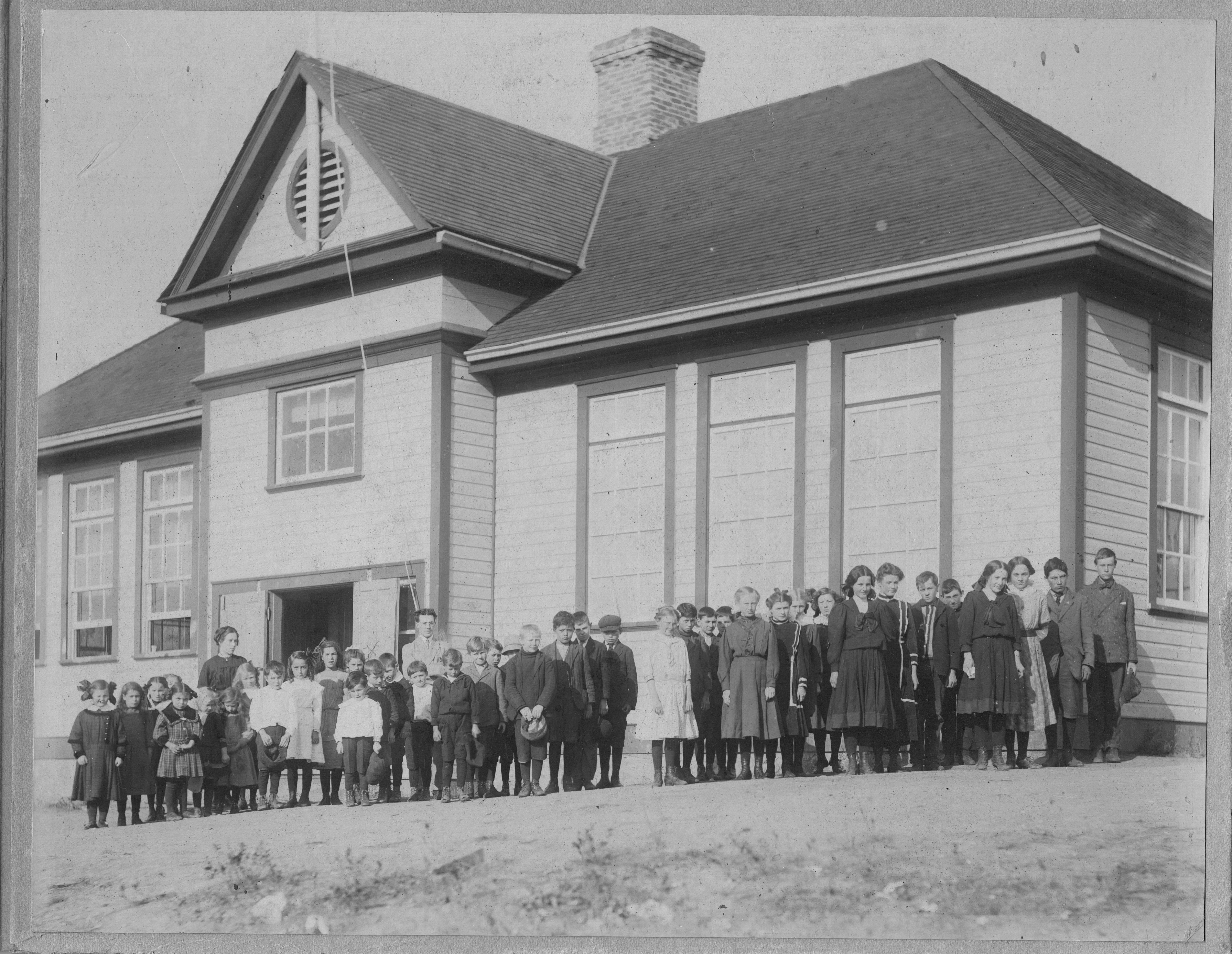 Object Desc Elphinstone School 1912-13. Bill, Frank, and Alex Gerrard are under the x". Mr Esray (principal/teacher) and possibly Mrs Irwin(nee Margaret McKerchar)