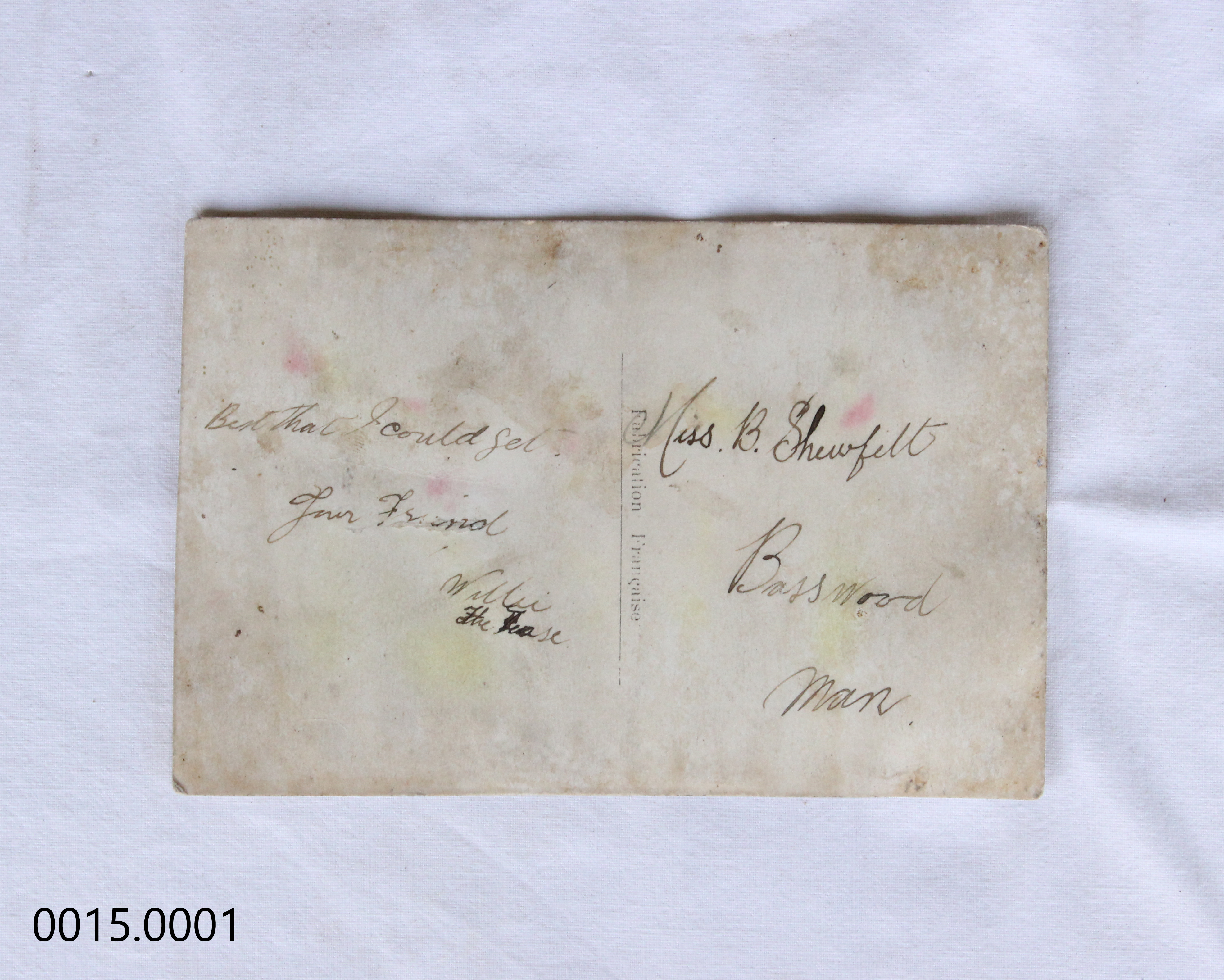 Object Desc Addressed to Miss B. Shewfelt from Basswood, MB. "Best that I could get. Your Friend, Willie the Tease."