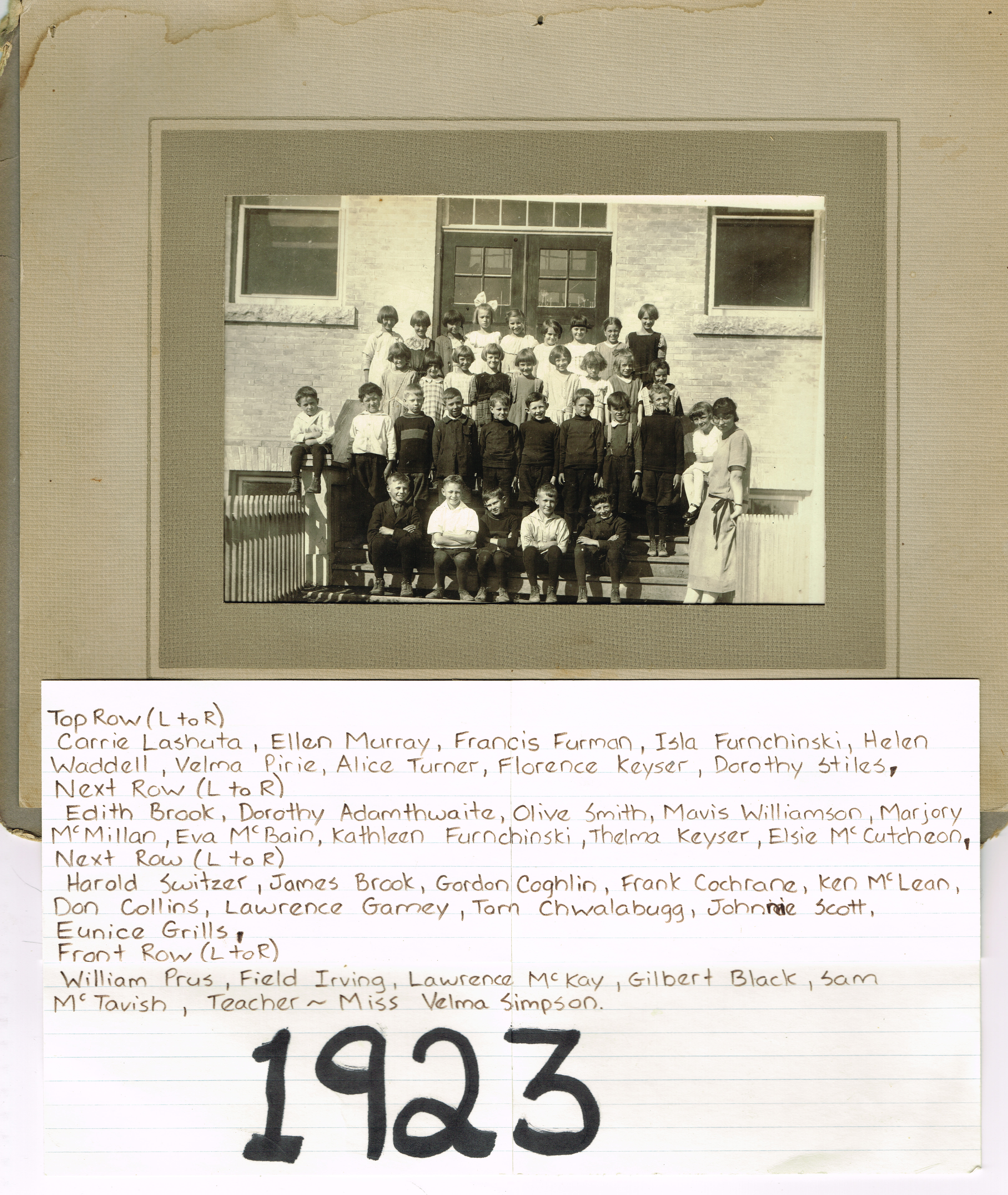 Description Top Row: Carrie Lashuta, Ellen Murray, Francis Furman, Isla Furnchinski, Helen Waddell, Velma Pirie, Alice Turner, Florence Keyser, Dorothy Stiles Next Row: Edith Brook, Dorothy Adamthwaite, Olive Smith, Mavis Williamson, Marjory McMillan, Eva McBain, Kathleen, Furnchinski, Thelma Keyser, Elsie McCutcheon Next Row: Harold Switzer, James Brook, Gordon Coghlin, Frank Cochrane, Ken McLean, Don Collins, Lawrence Gamey, Tom Chwalabugg, Johnnie Scott, Eunice Grills Front Row: William Prus, Field Irving, Lawrence McKay, Gilbert Black, Sam McTavish Teacher: Miss Velma Simpson