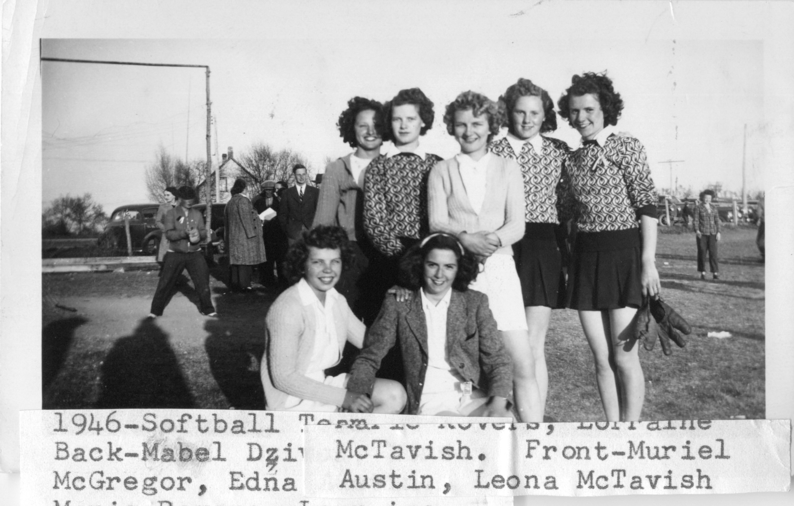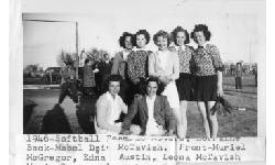 Description 1946 Softball Team Back Row L-R: Mabel Dziver, Doreen McGregor, Edna Austin, Marie Rovers. Lorraine McTavish Front Row L-R: Muriel Austin, Leona McTavish