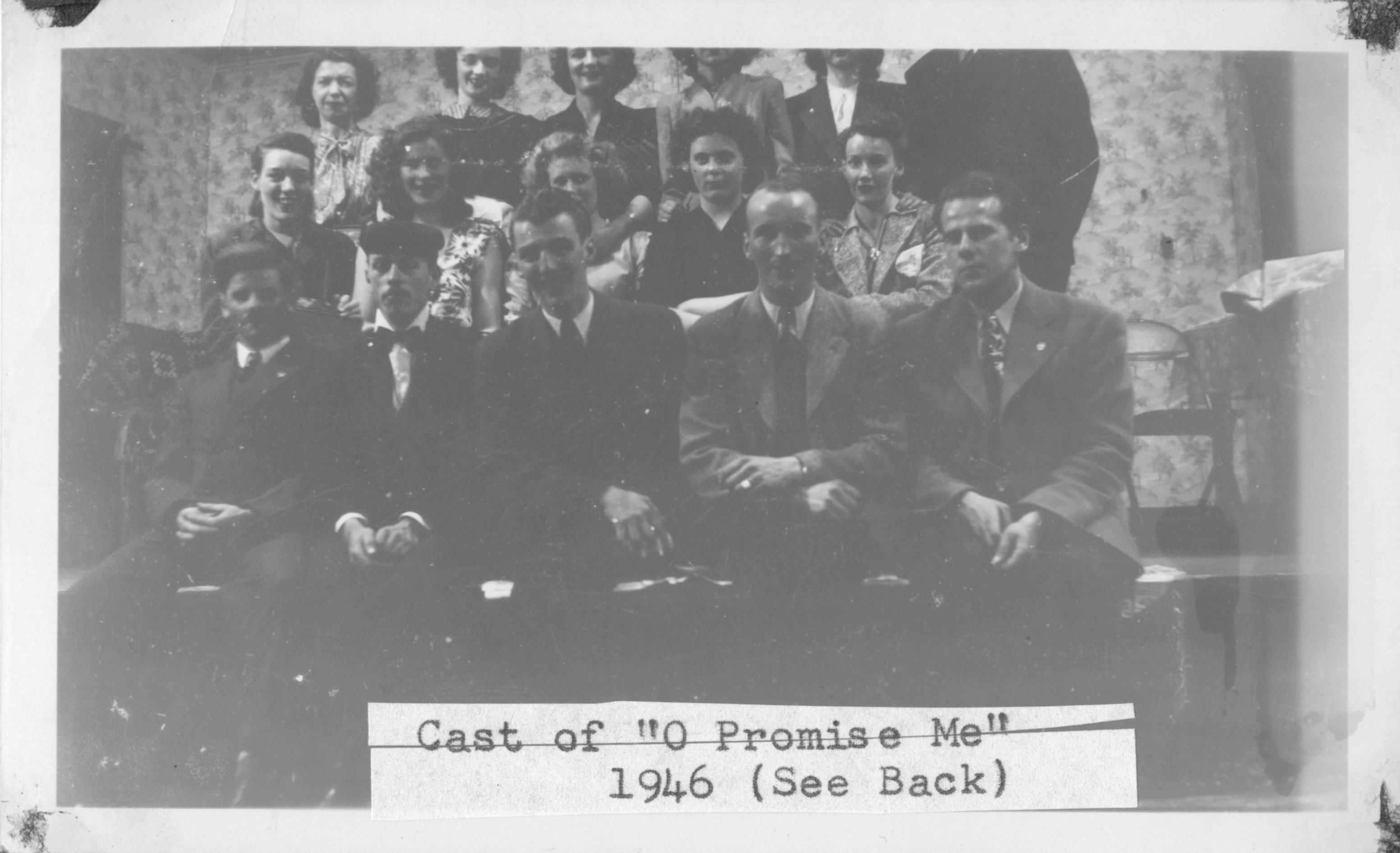 Description Cast of "O Promis Me" 1946 Back Row L-R: Miss Shanks, Norma Burnell, Edna Austin, Lorrain McTavish, Shirkey Head, unknown Middle Row L-R: Monty Henderson, Ann Riley, Jean Watson, Lila Preston, Margaret Millman Front Row L-R: Louis Kulchycki, Ernie Orpin, Lorne Finkbeiner, Mel Wilson, Bob Robinson