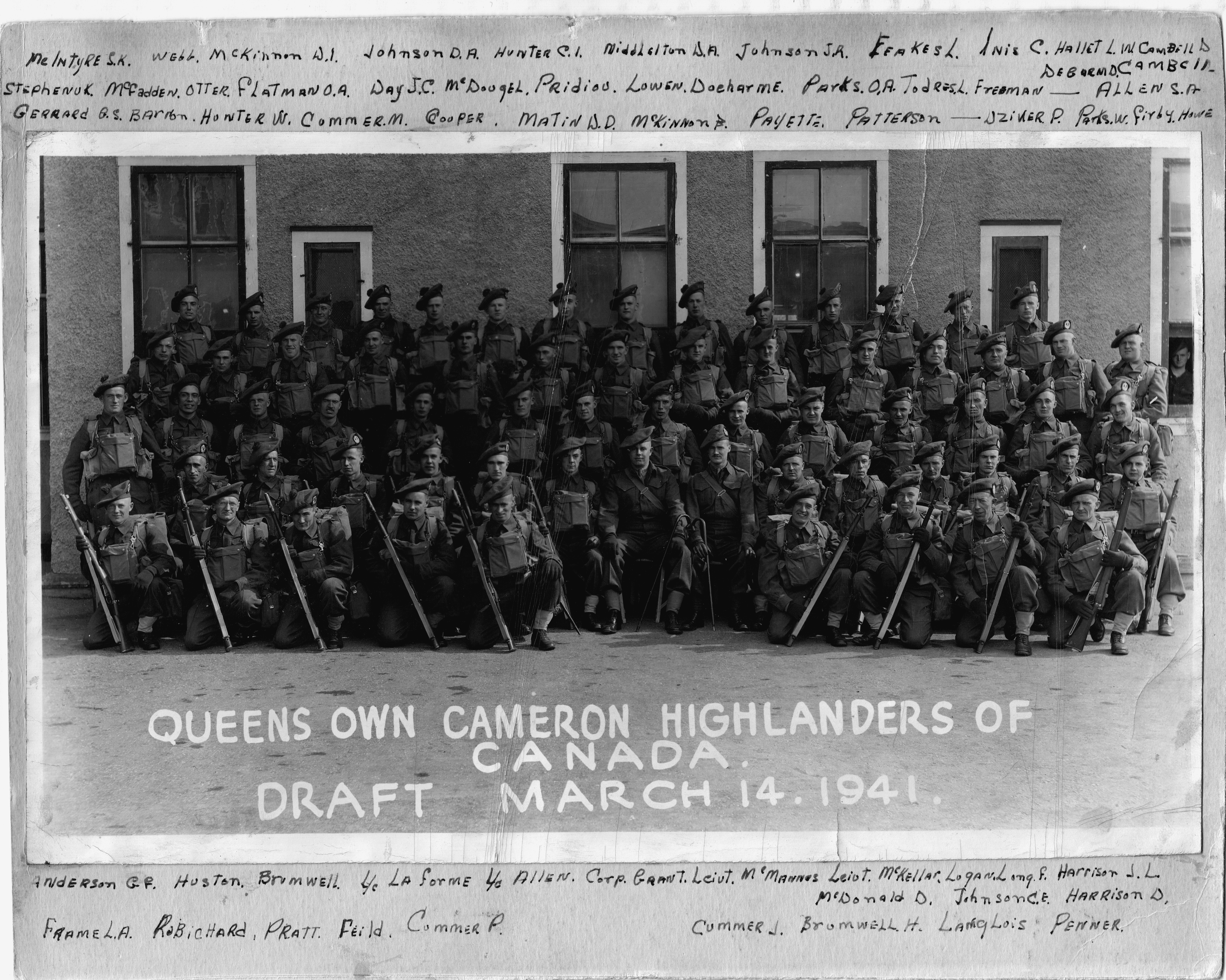Description Queen's Own Cameron Highlanders of Canada Draft March 14 1941 McIntye S.K., Webb, McKinnon D. I., Johnson D.A.. Hunter C.I.,Middleton D. A., Johnson J. R., Feakes L., Inis C., Hallet L. W., Cambell D.,Deberm D., Cambell, Stephenuk , McFadden, Otter, Flatman O. A., Day J. C., McDougel, Pridiou, Lowen, Docharme, Parks O. A., Todres L.. Freeman, Allen S. A., Gerrard G. S., Barron, Hunter W., Commer M, Cooper, Matin D. D., McKinnon B., Payette, Patterson, Dziver P., Parks W., Firby, Howe, Anderson G. F., Huston, Bromwell, L/C LaForme, L/C Allen, Corp Grant T., Lieut McMannes, Lieut McKellar, Logan , Long F., Harrison J. L., Frame L. A., Robichard, Pratt, Field, Commer, P., Cummer J., Bromwell H., Langlois, Penner