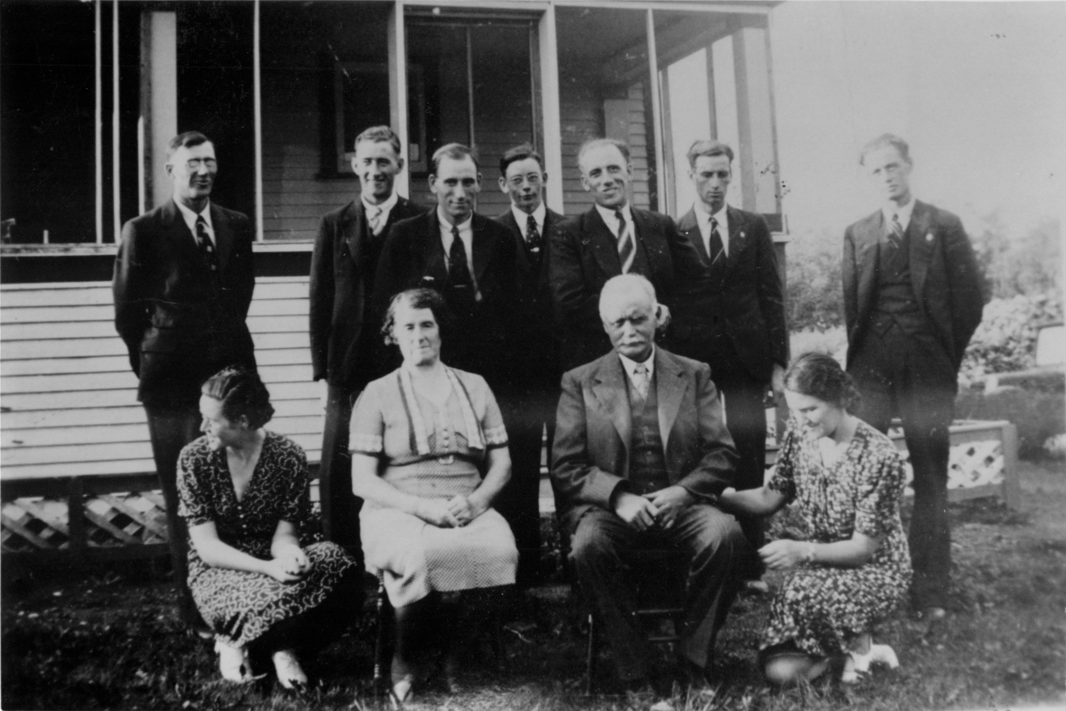 Object Desc Gerrard Family Christmas Day, 1939 Back Row L-R: Andrew, Peter, Bill, Ted, Frank, Joe, George Front Row L-R: Jean, Jeannie, Alex, Alexina