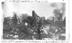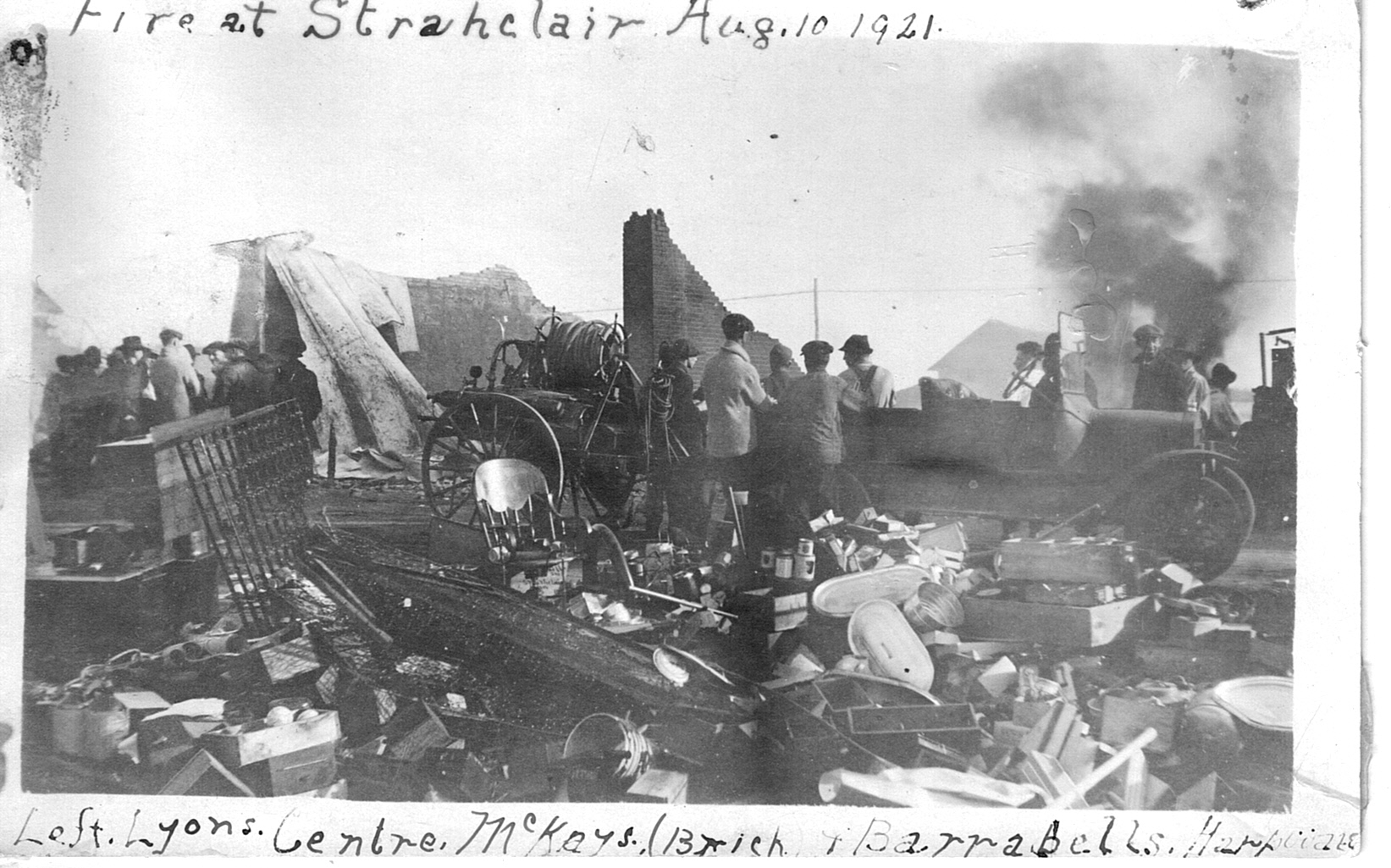 Object Desc Strathclair's worst fire. Started in laundry just east of Patterson store. Burnt the laundry, Alex Lyon's Butcher Shop next to east, then J. R. McKay's General Store and Barradell's Hardware. The Hotel fire wall and shutters saved the Hotel and stopped
