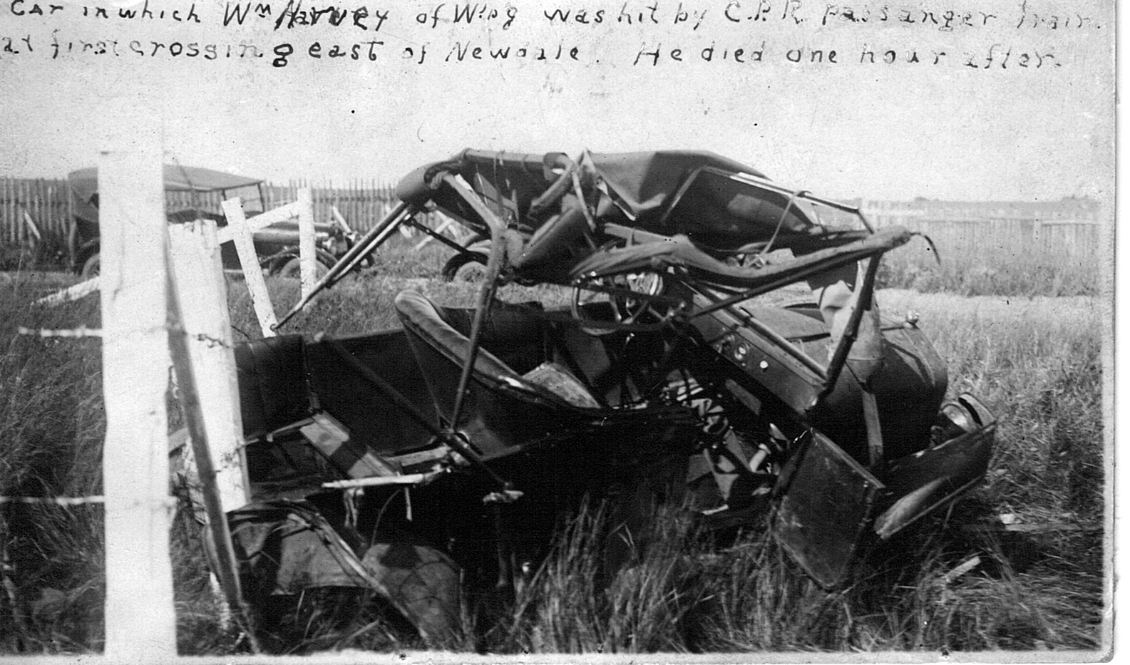 Notes This car, Model Coupe Ford "T" was owned by Wm Harvey, a traveler fro the North Star Oil Co. Mr. Harvey was at the Basswood Station when the Way Freight was pulling out for Newdale and he told the trainmen he would beat them to Newdale. He nearly did, but he died an hour later. (The old road was used to cross the tracks at Newdale, just east of the Stock yards. ) This happened in 1915