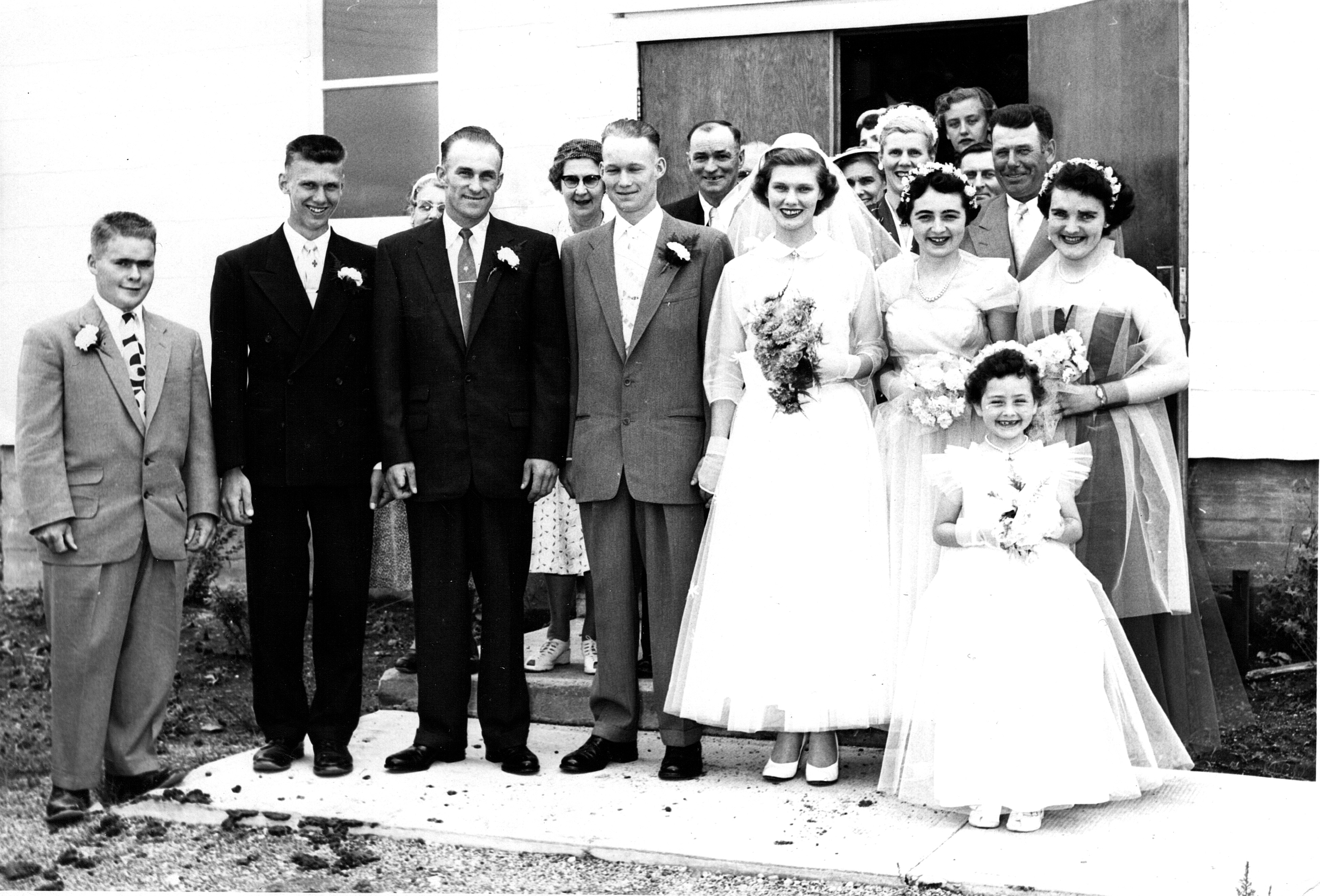 Description Wedding of Gordon Sivers and Jean Ann Smith. L-R: Bing (Arnold) Bradley, Bev La Salle?, Keith Sivers, Gordon Sivers, Jean Ann Smith, Behind Gordon is his parents Hazel and Jim Sivers. Behind Jean Ann and to the left are her parents Stan and Flora Smith. The Smiths ran the hotel fro a time.
