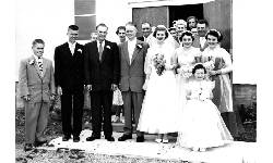 Object Desc Wedding of Gordon Sivers and Jean Ann Smith. L-R: Bing (Arnold) Bradley, Bev La Salle?, Keith Sivers, Gordon Sivers, Jean Ann Smith, Behind Gordon is his parents Hazel and Jim Sivers. Behind Jean Ann and to the left are her parents Stan and Flora Smith