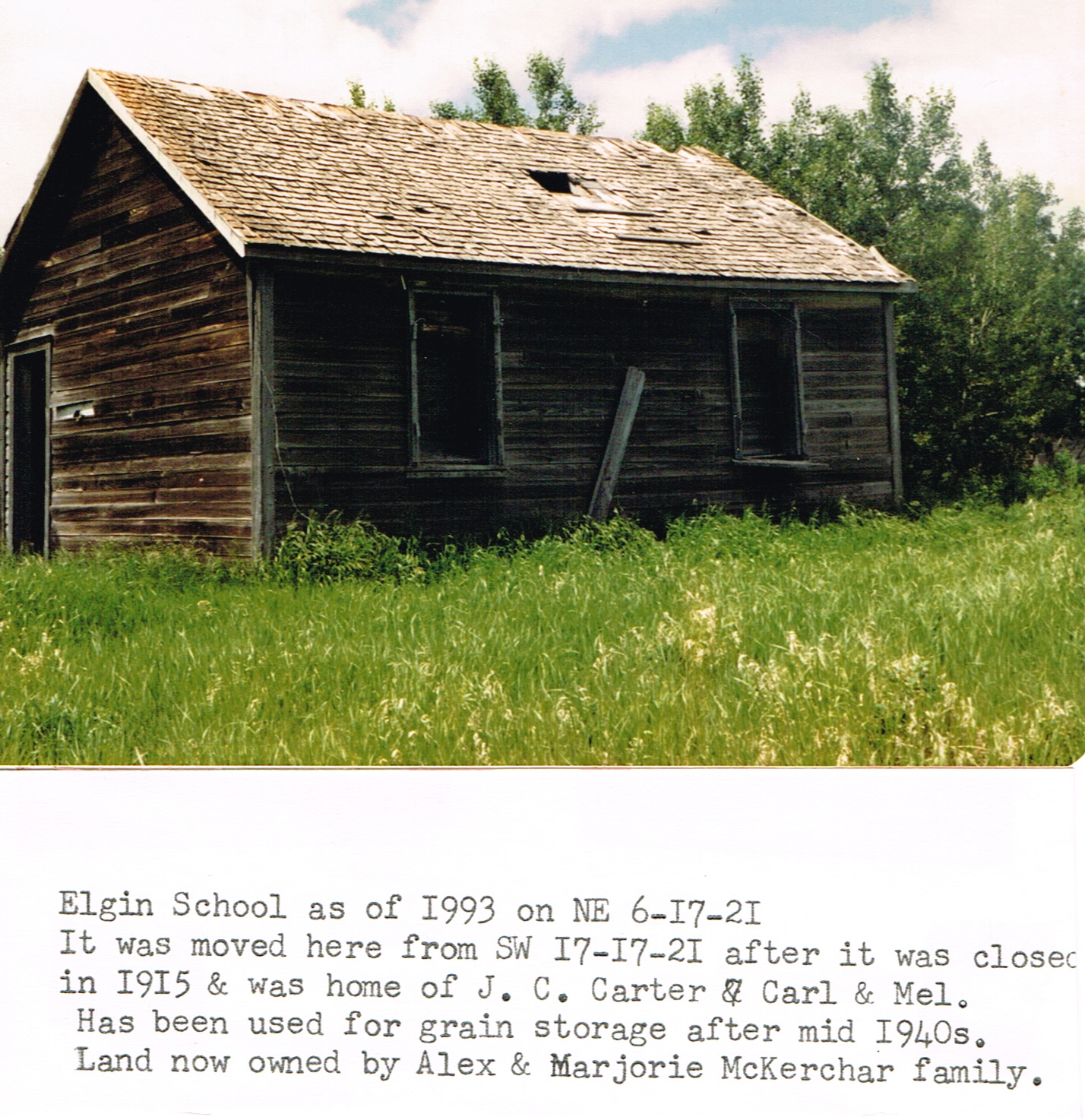 Object Desc Elgin School as of 1993 on NE 6-17-21. It was moved here from SW 17-17-21 after it was closed in 1915 andwas the home of J. C. Carter and Carl & Mel. Has been used for grain storage after mid 1940's. Land now owned by Alex & Marjorie McKerchar & family