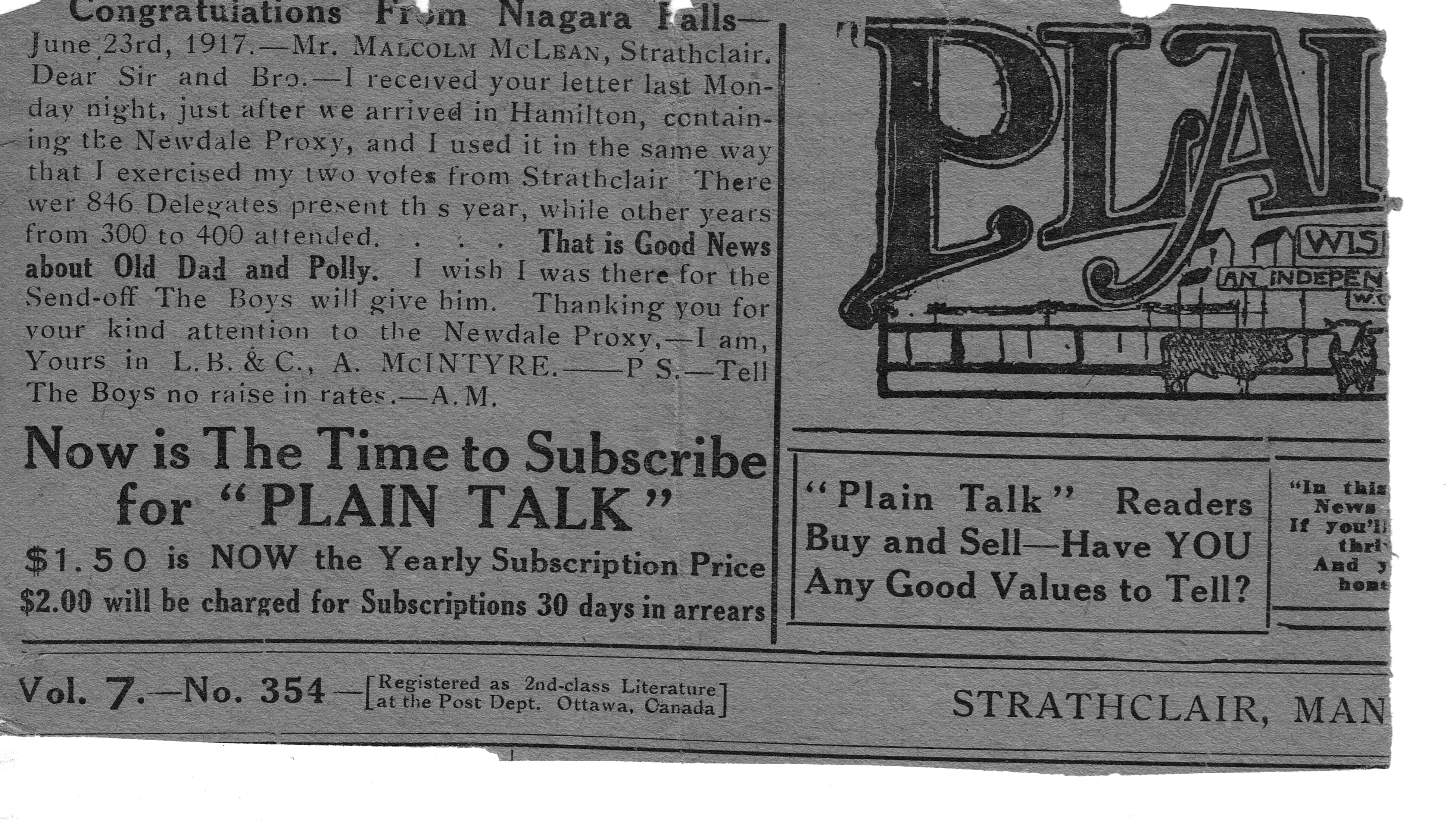 Object Desc Newspaper Clipping from A. McIntyre of Niagara Falls to Malcolm McLean. Newspaper clipping from June 23, 1917