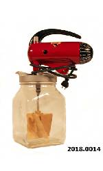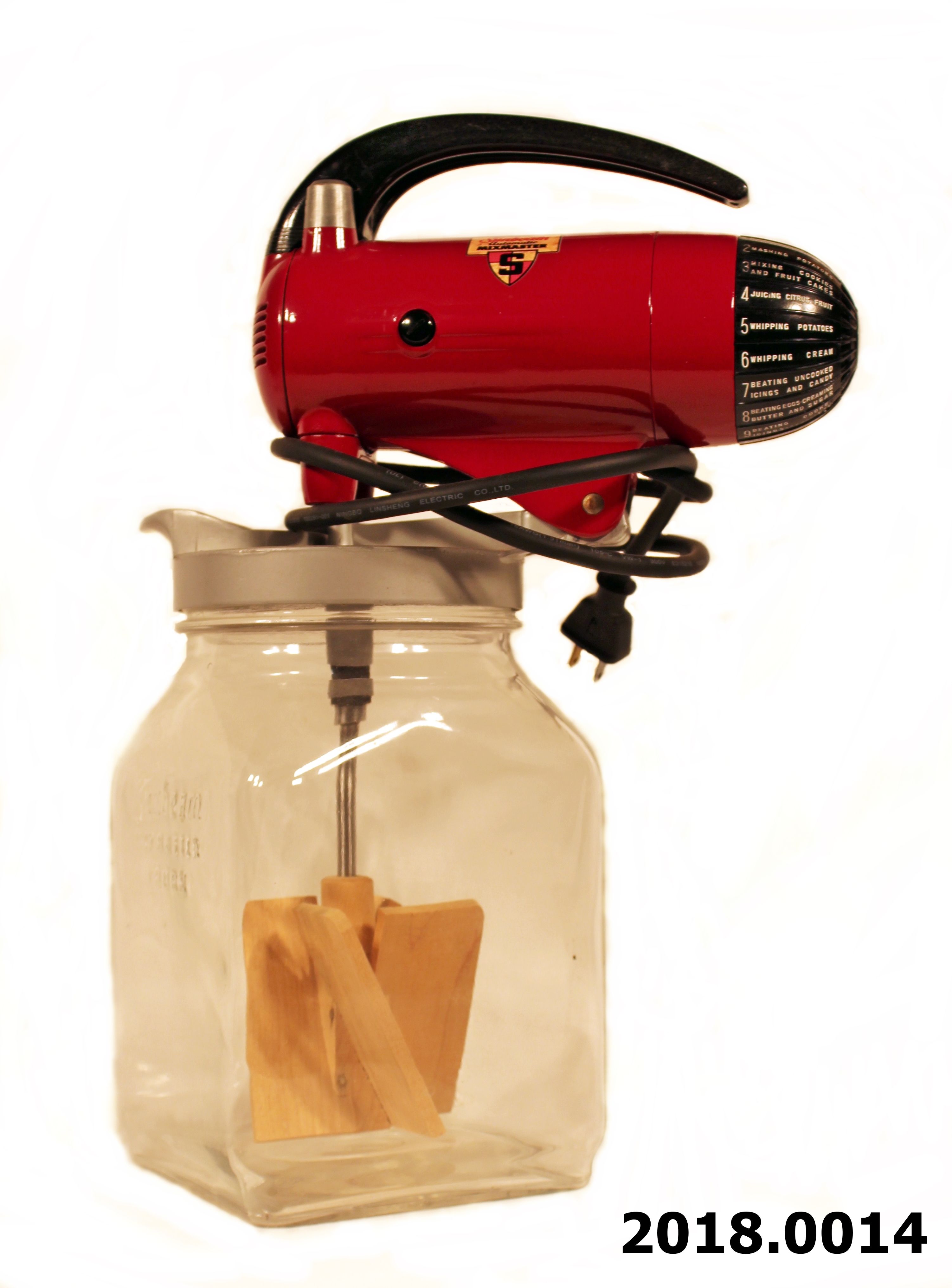 Object Desc Red Sunbeam stand mixer with butter churn attachment.This Sunbeam Mixmaster with butter churn attachment began manufacturing on June 15, 1940. It continued production until 1941 and started again in 1947-1949.