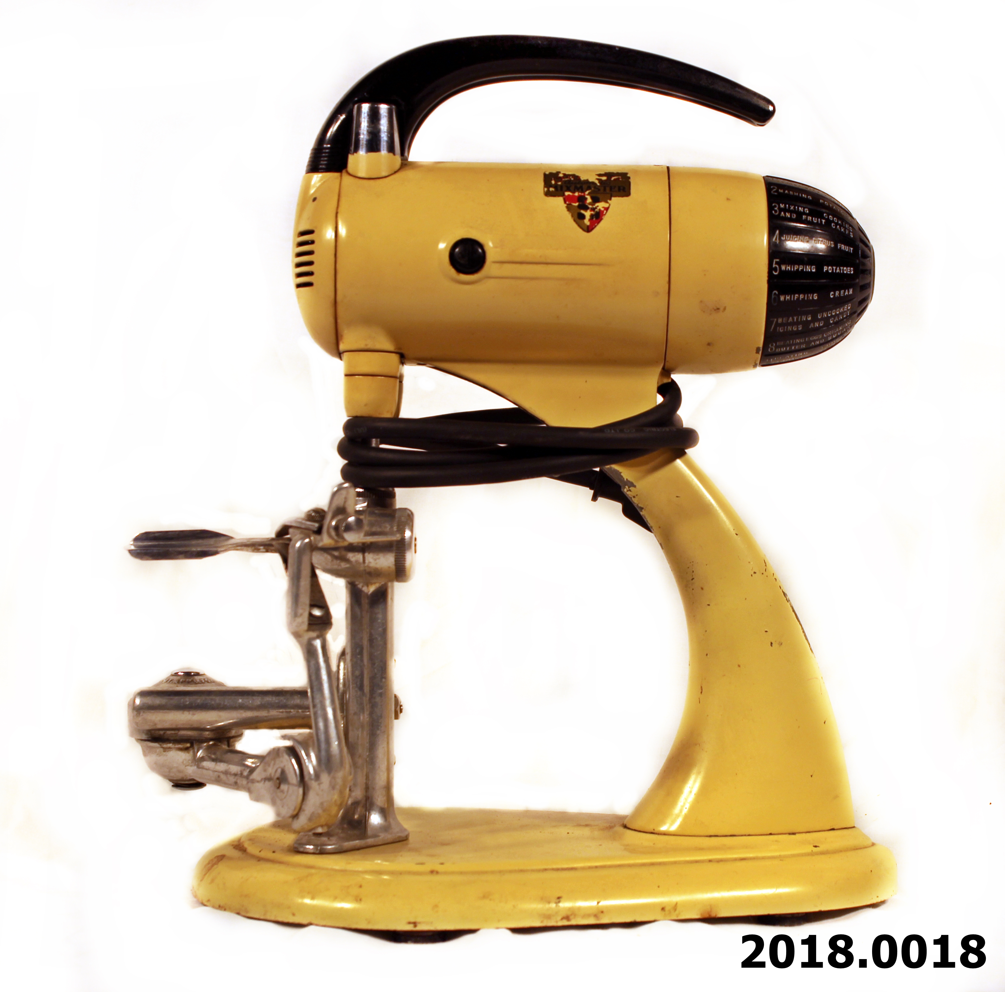 Object Desc Sunbeam Mixmaster (cream) with potato/apple peeler with spring loaded potato attachment. Could also peel an apple. This attachment started manufacturing in May of 1933. The peeler was driven by the beater drive but had its own internal gearing