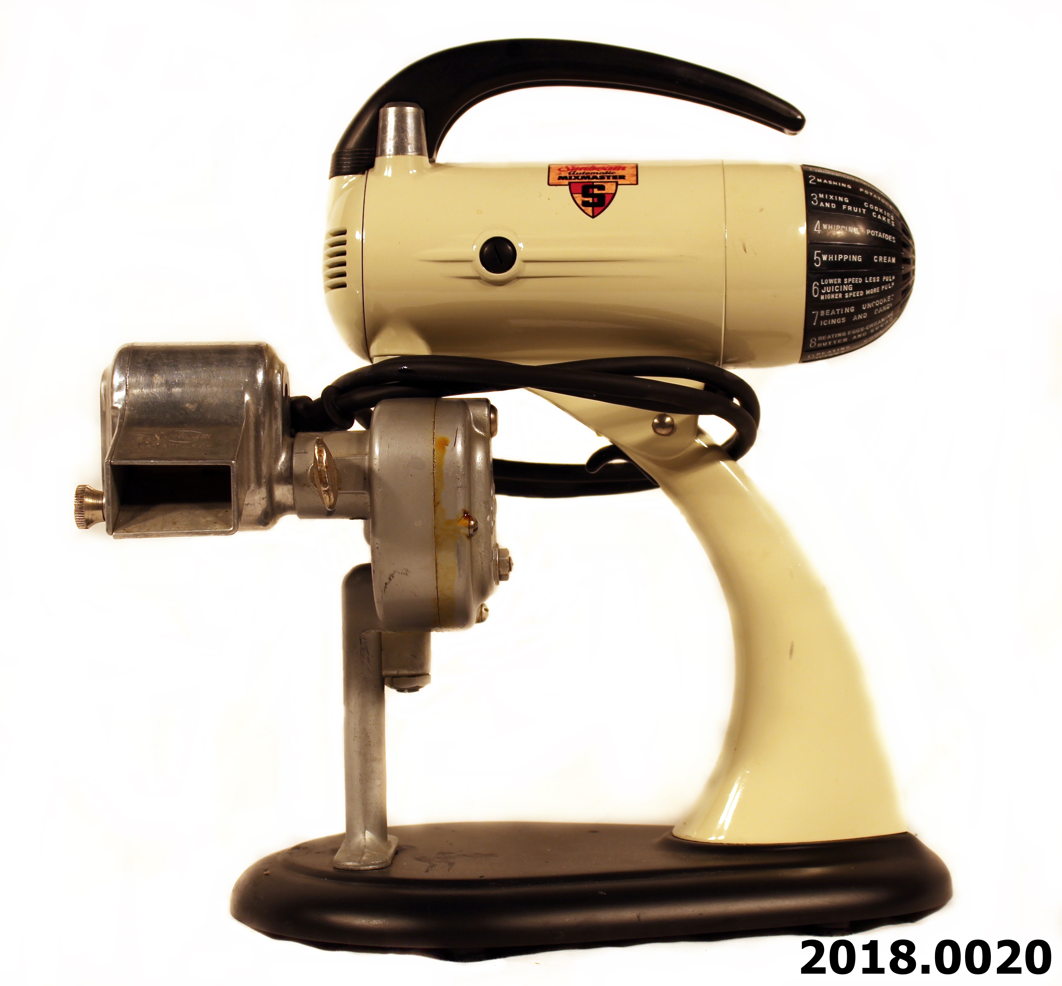 Notes This Sunbeam Mixmaster with pea sheller attachment was manufactured in August 1934- May 1937 (PTO drive) and again in September 1937 (Beater Shaft Drive). This attachment was used to shell dry peas and beans. 3 million of this model was sold, but not in Canada. 2018.0020