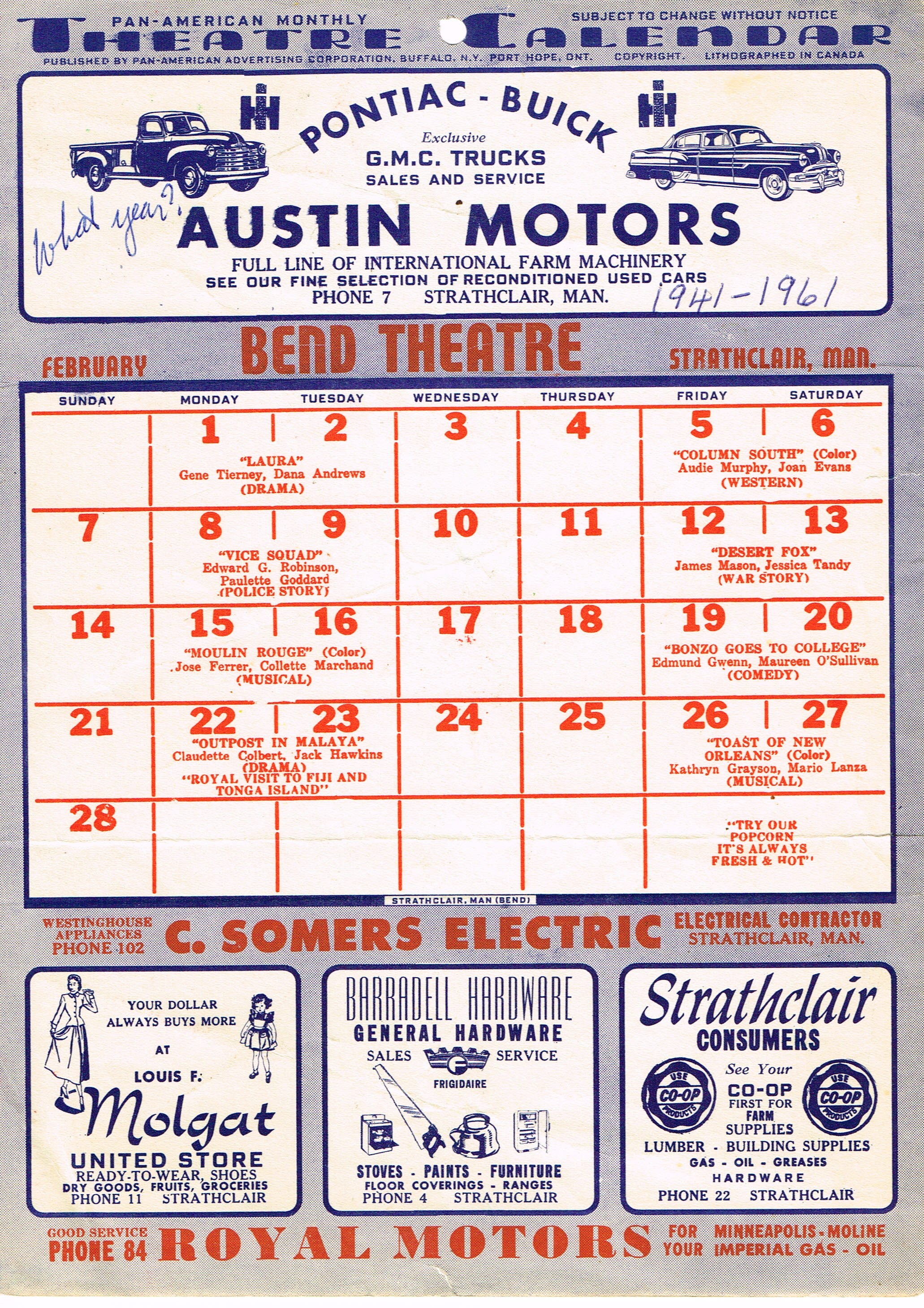 Object Desc Advertisers: Austin Motors, Louis F. Molgat, Barradell Hardware, Strathclair Coop, Royal Motors, C. Somers Electric