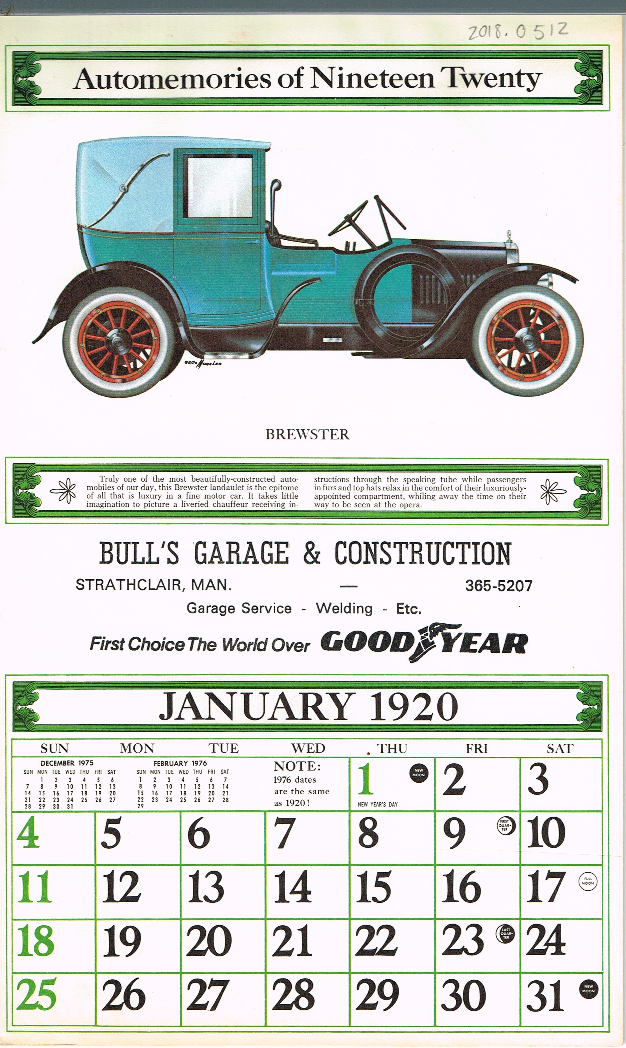 Object Desc Calendar from 1920. Bull's Garage and Constuction. Dauphin Musuem had this calendar in their collection, and gifted it to Strathclair Museum
