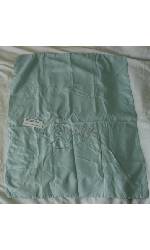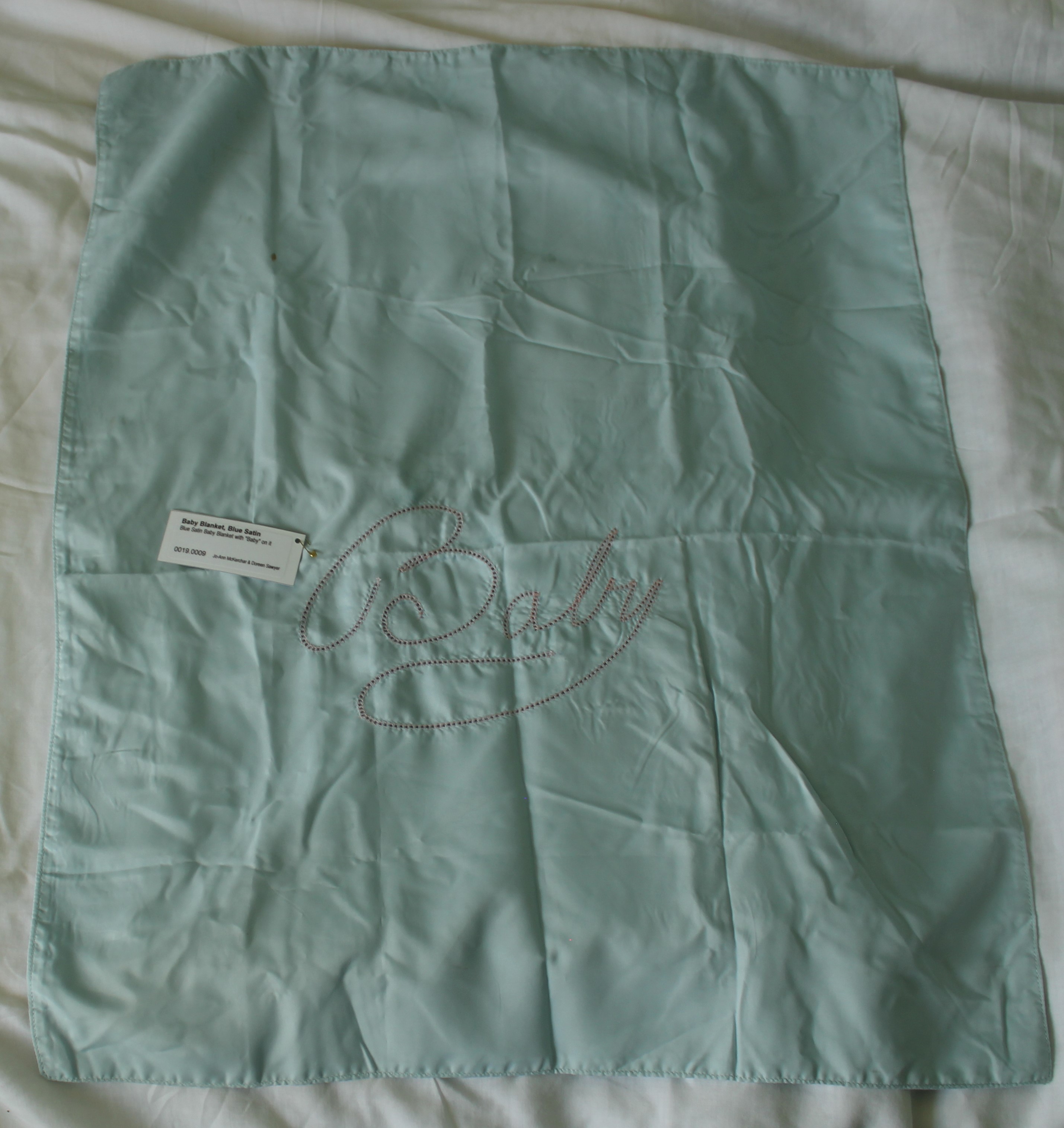 Object Desc Blue Satin Baby Blanket with "Baby" on it