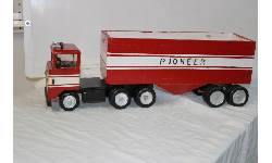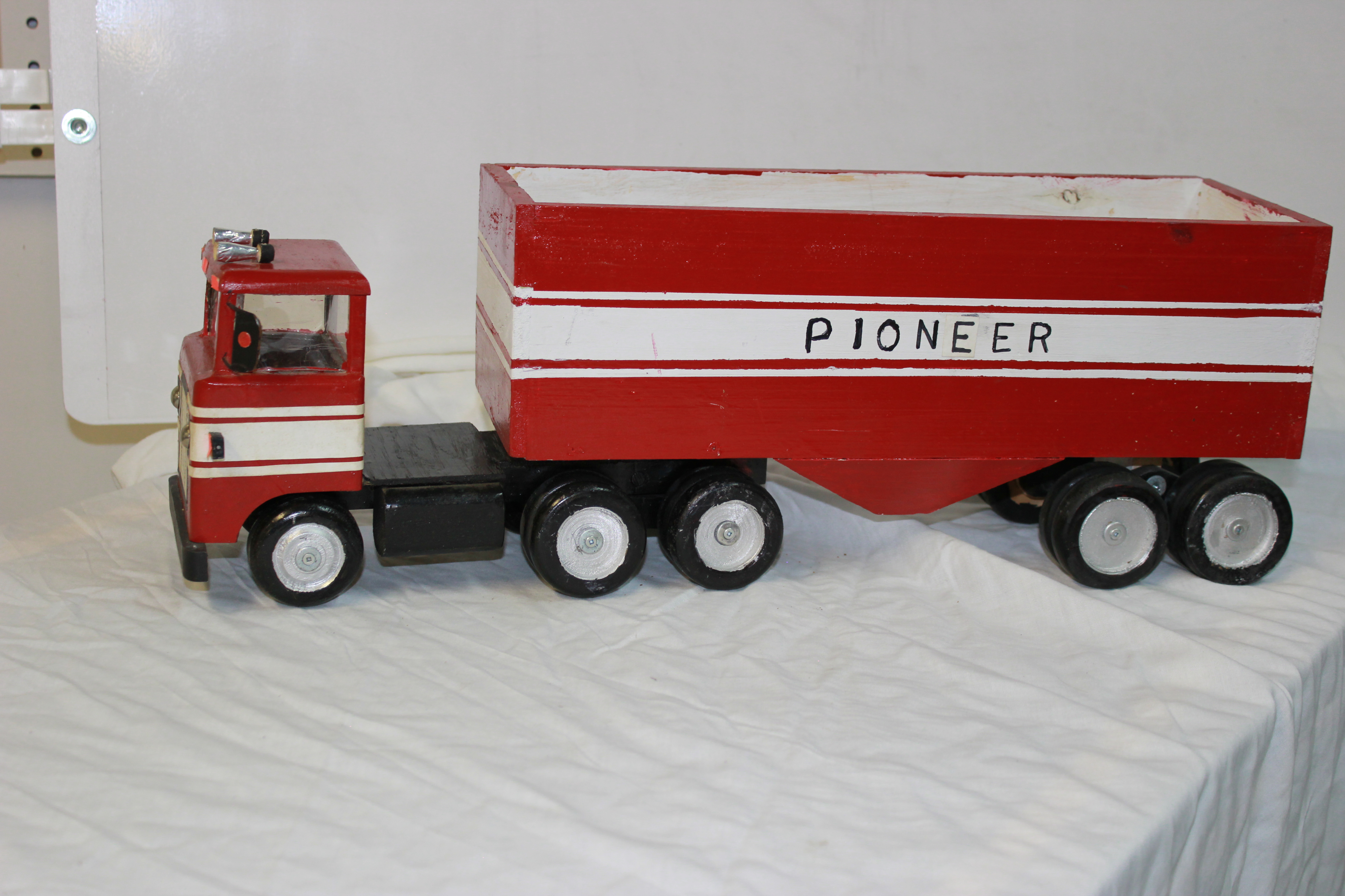 Object Desc Truck, Semi, Red & White, Grain Truck (?), Wooden, Handcrafted by Ralph Zachary of Sandy Lake