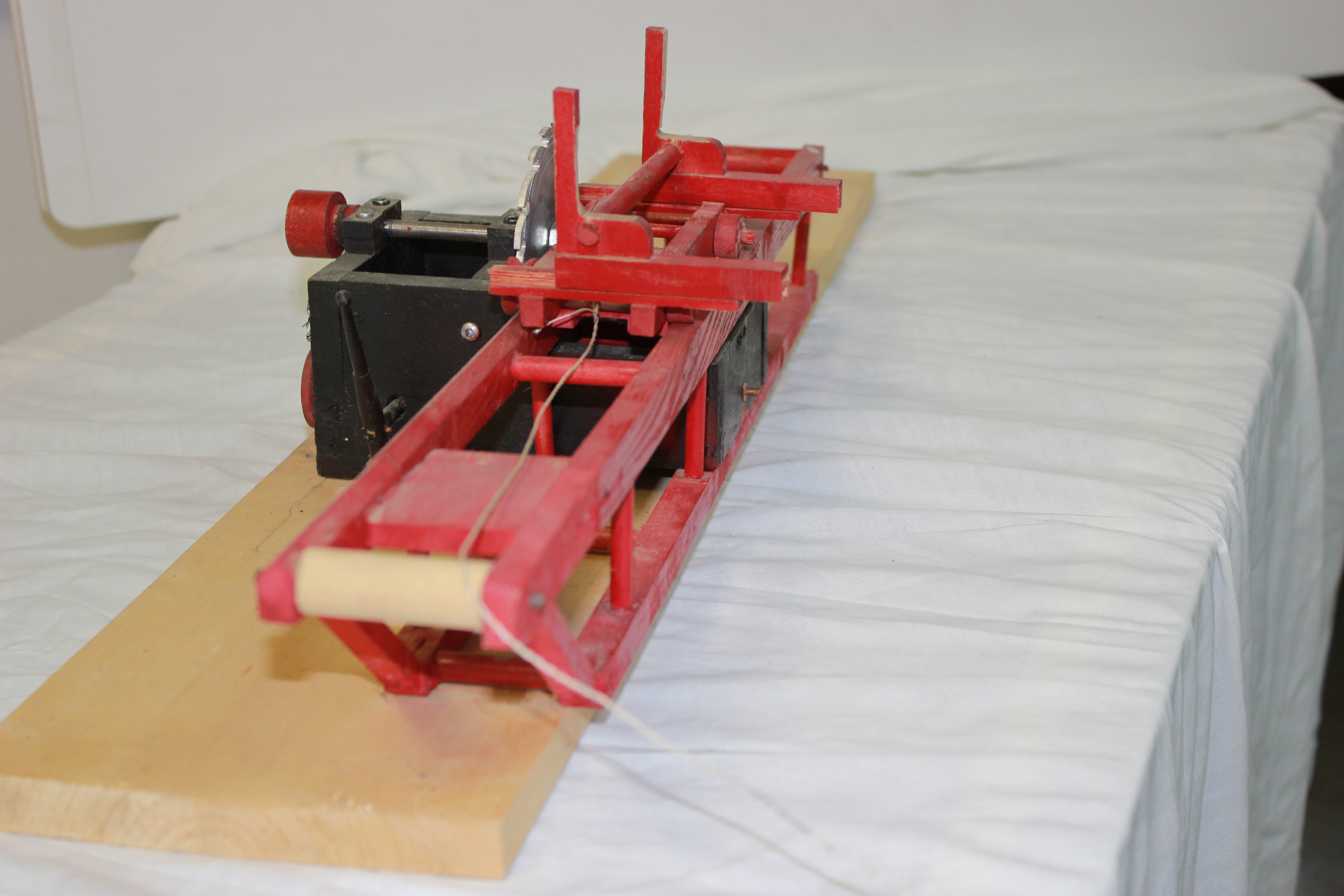 Object Desc Log Cutter, Wooden Model, Handcrafted by Ralph Zachary of Sandy Lake