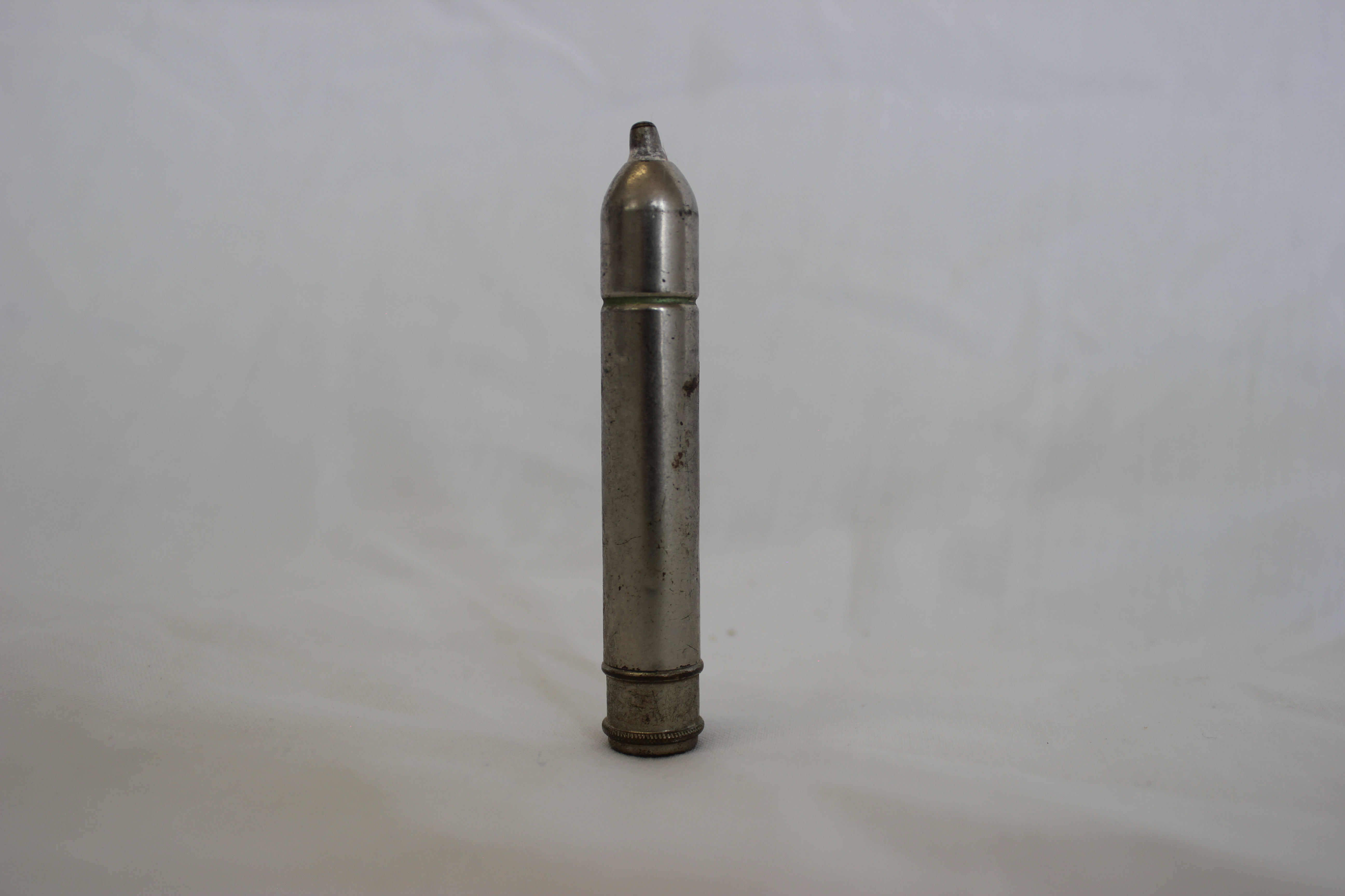 Object Desc Faced powder holder for your purse, owned by Merle Scott. Gayleen Stimpson's mother, small silver tube