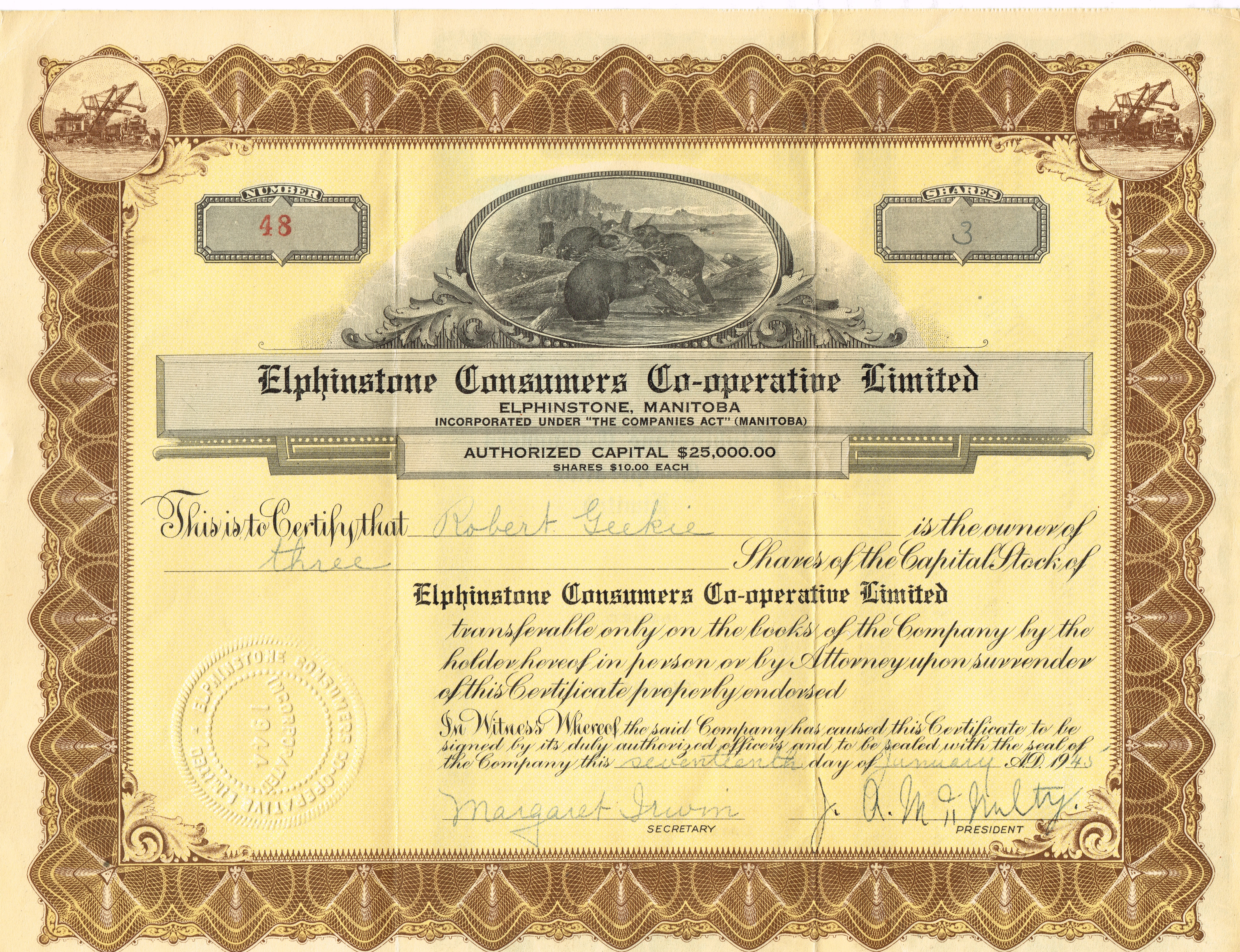 Object Desc A certificate stating that Robert Geekie was the owner of 3 shares of the capital stock of Elphinstone consumers Co-operative Limited.