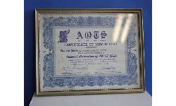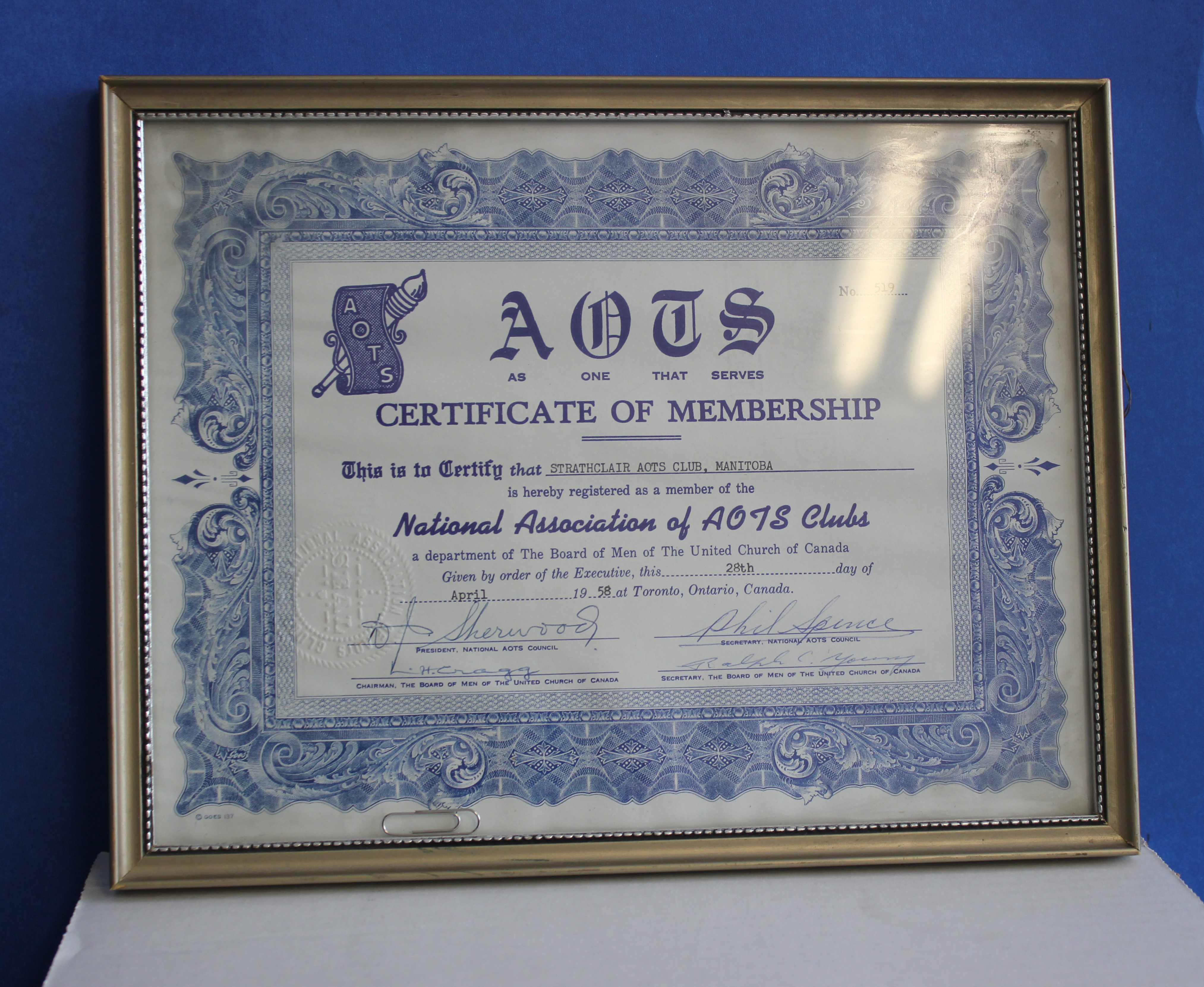 Object Desc As One That Serves (AOTS) Certificate of Membership for Strathclair AOTS Club to be registered as a member of the National Association of AOTS Clubs. From April 28, 1958.