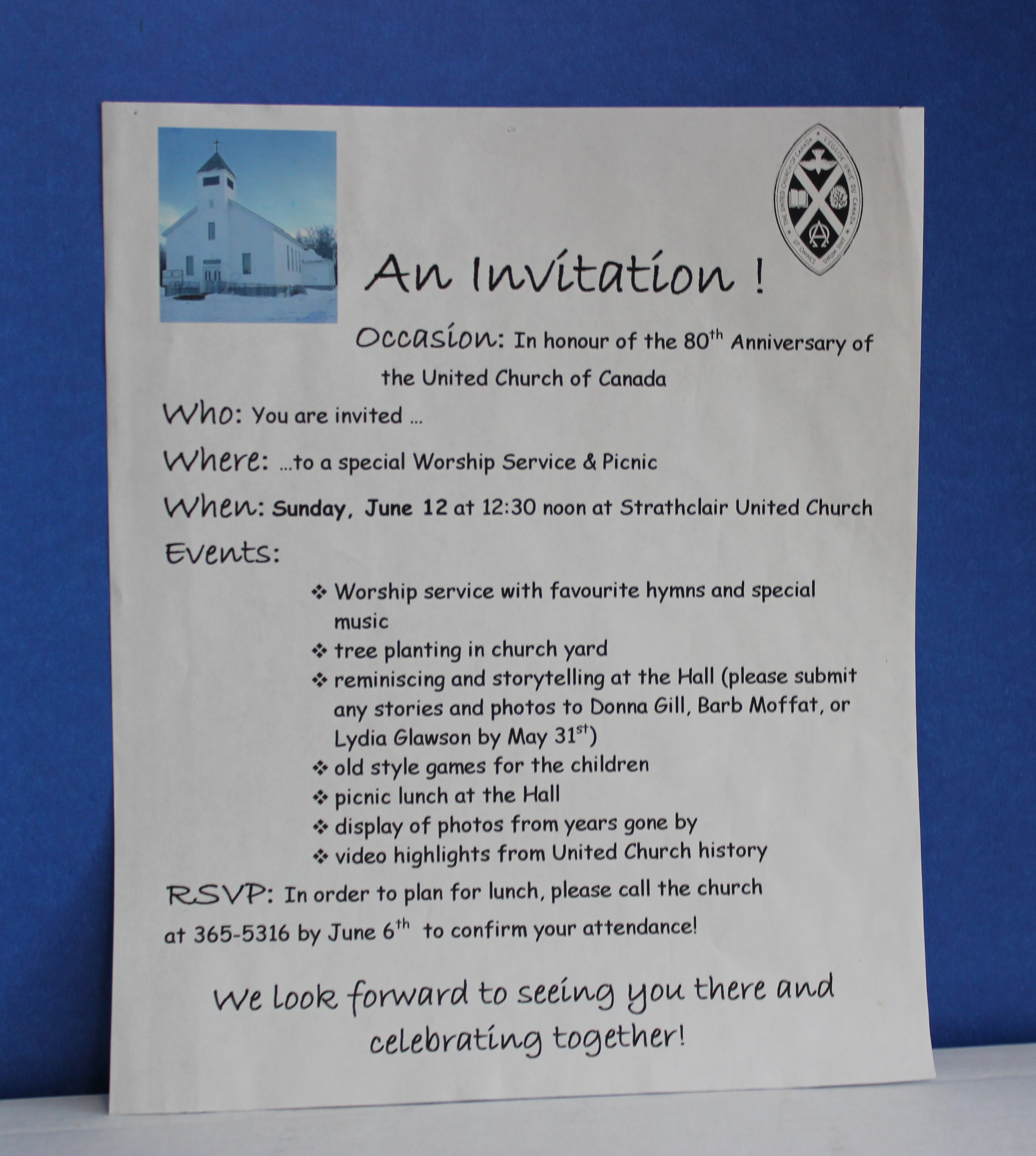 Object Desc United Church 80th Anniversary Invite for June 12, year unknown. Donated by the United Church Commitee.