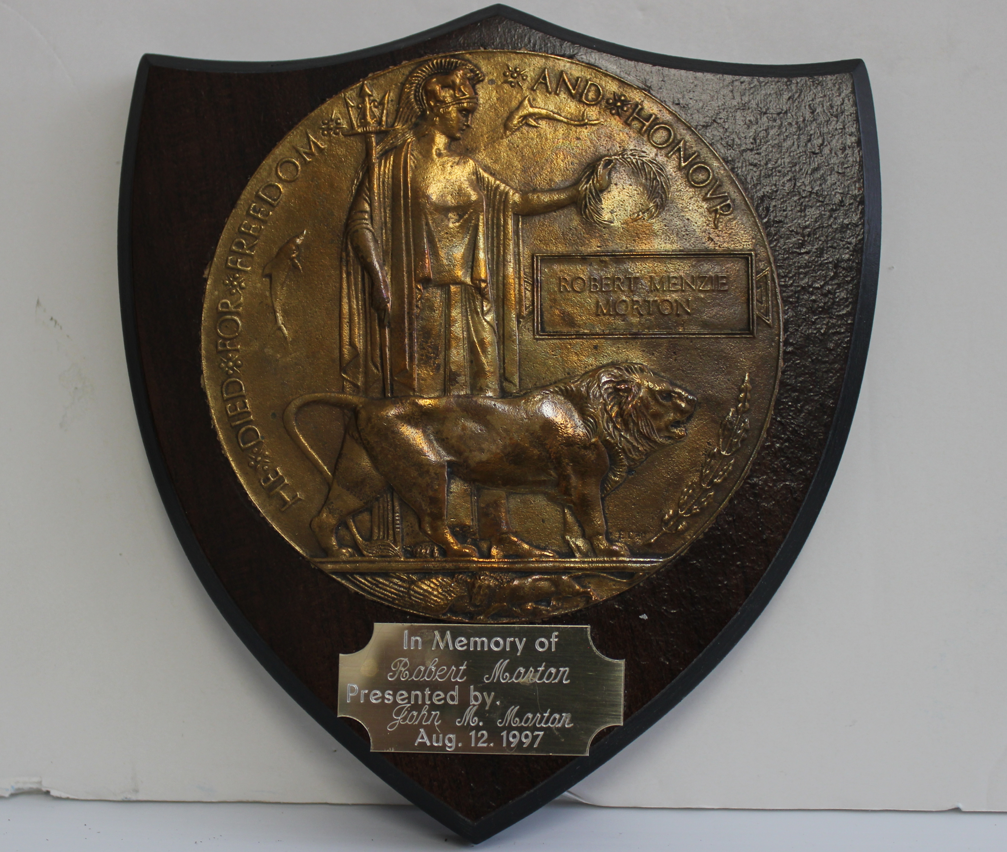 Object Desc Memorial Plaque for Robert Menzie Morton, presented by John M. Morton Aug. 12, 1997. Says "He died for freedom and honour" on it.