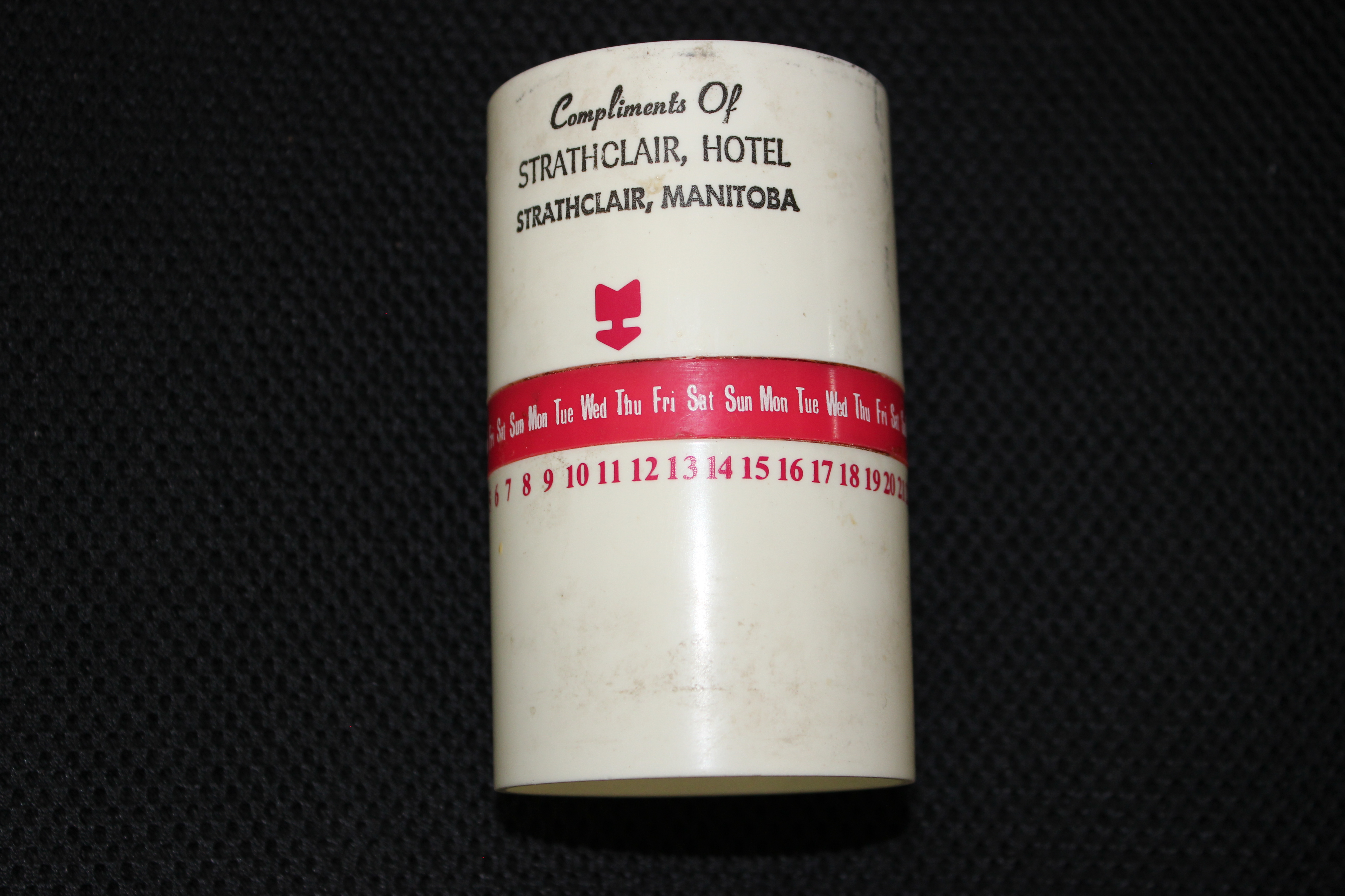 Object Desc Adjustable Strathclair Hotel cup calendar, with adjustable ring to change date. Was owned by Pauline Senko and donated by Ken and Kathy McDonald, Kathy is Pauline's daughter.