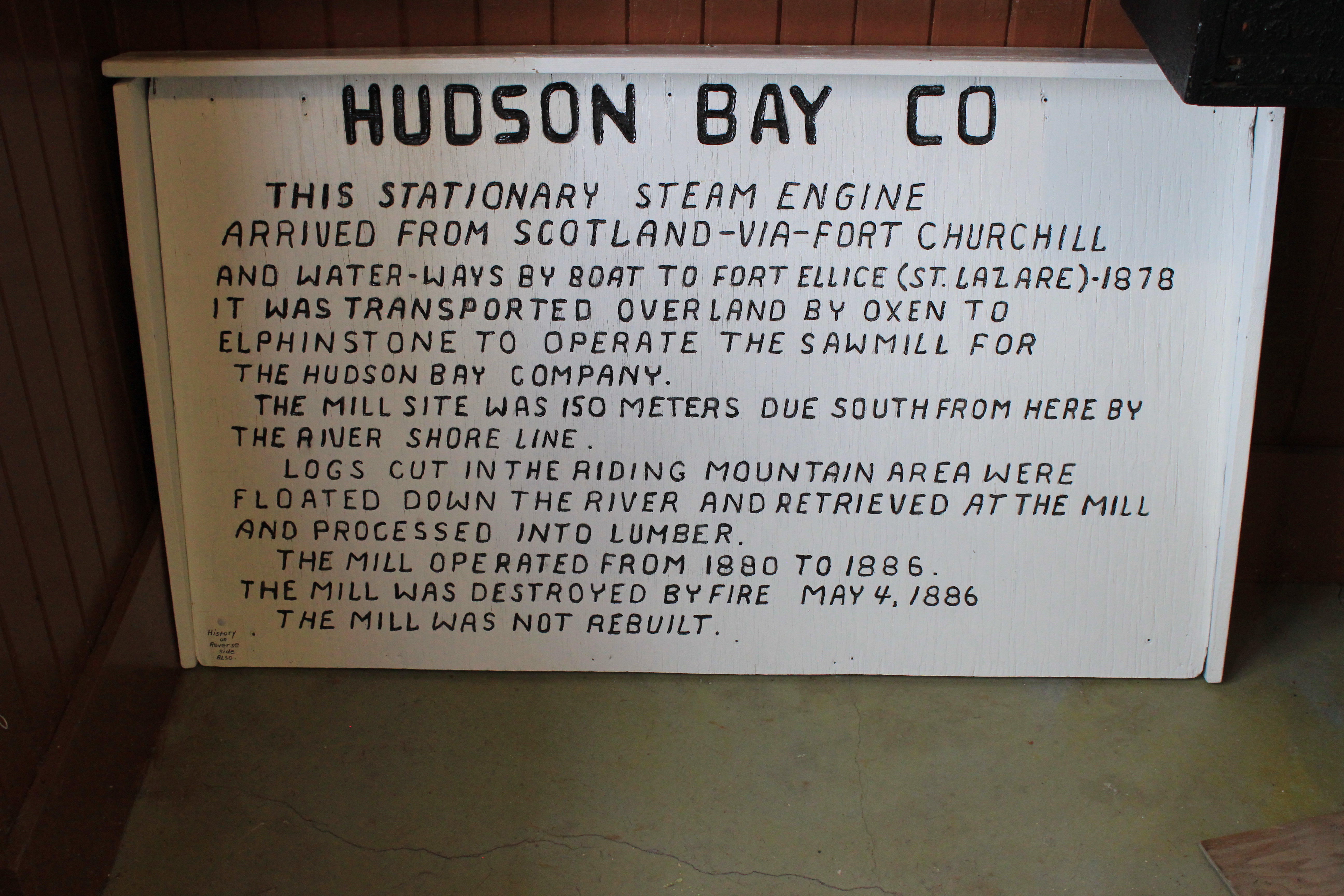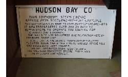 Object Desc Hudson Bay Co. sign made in the 1950s by Walter Gregorash of Elphinstone. The steam boiler came down the waterways by boat in the 1878 era, transported overland by oxen to Elphinstone to operate a sawmill. See more in notes.
