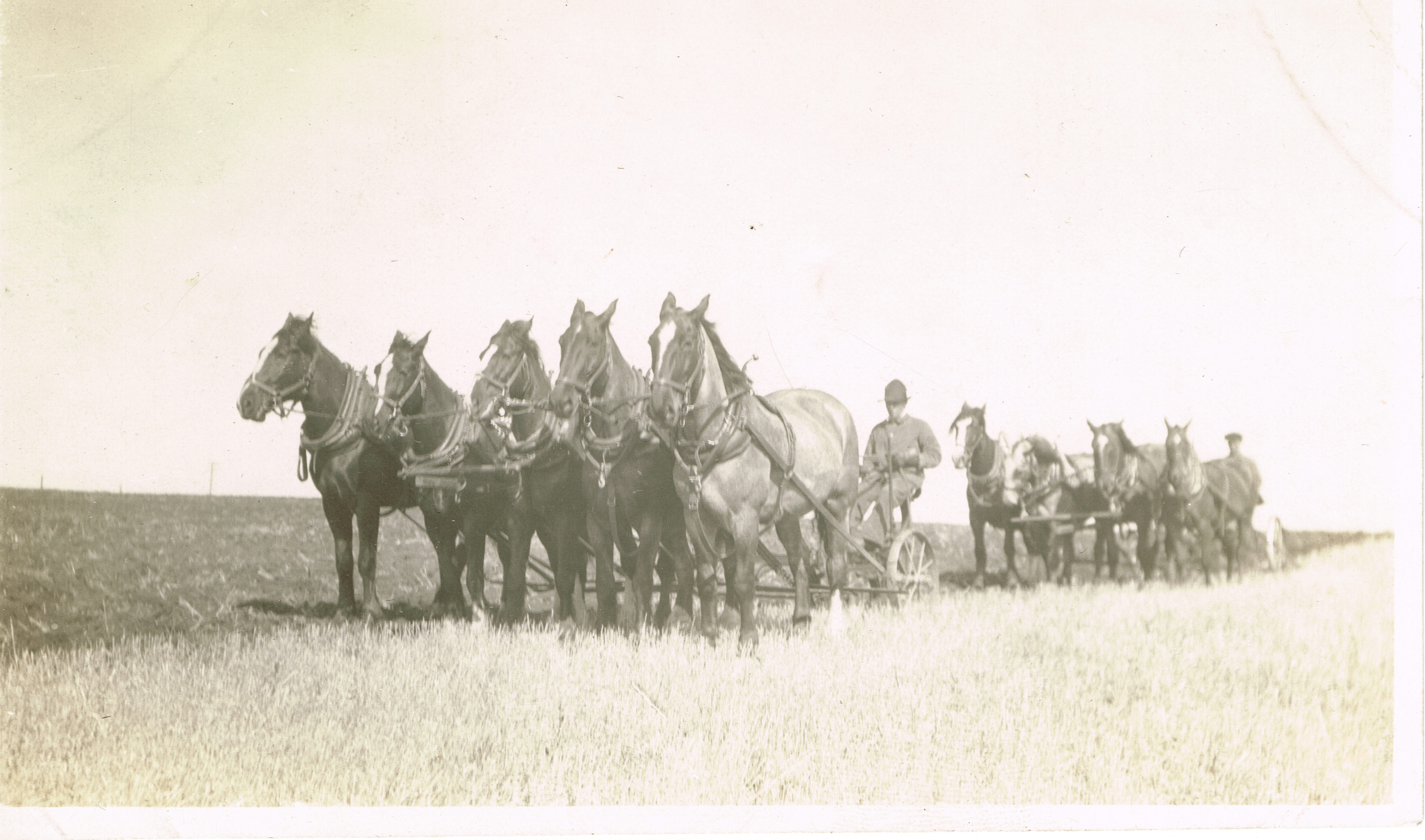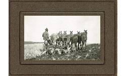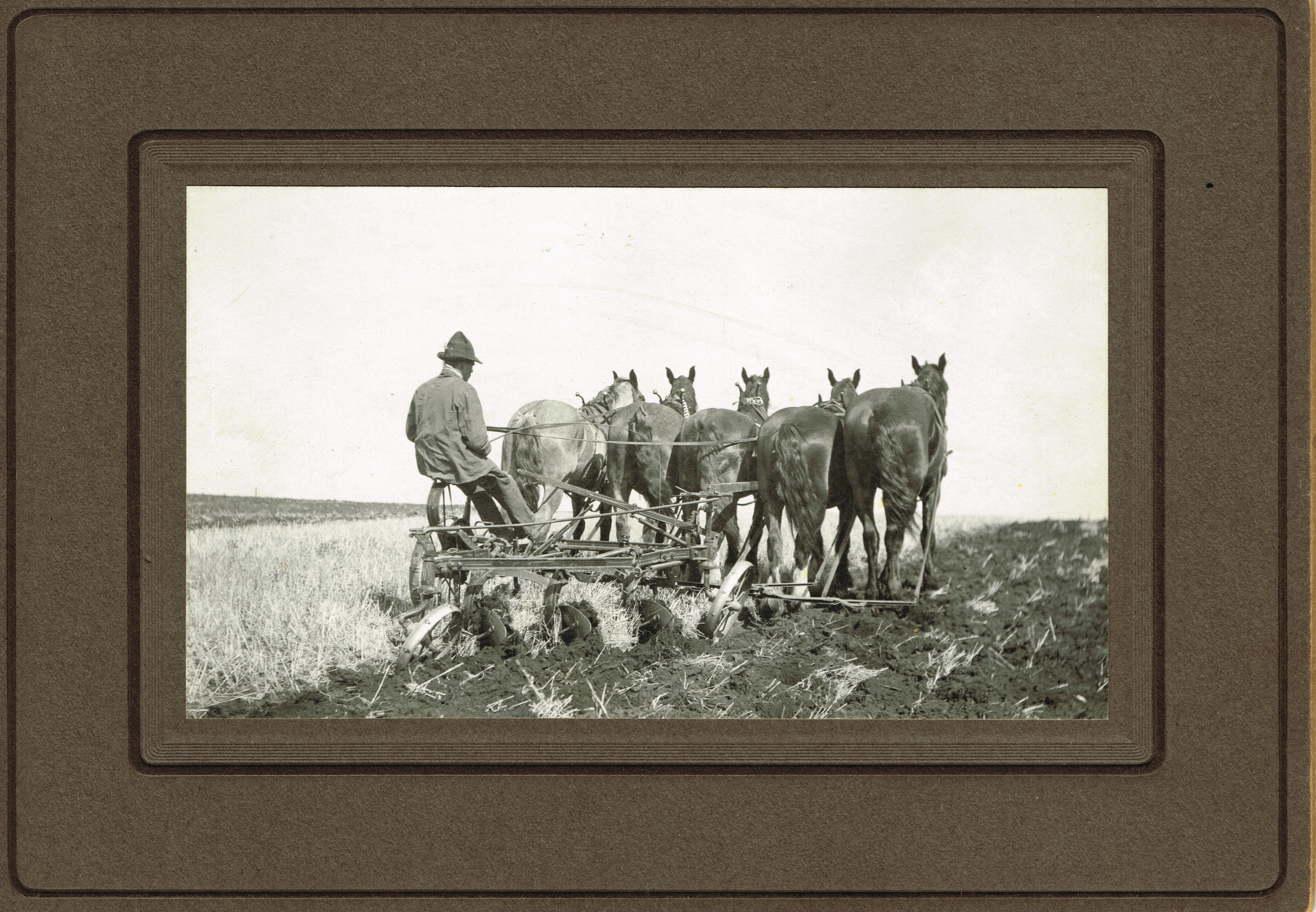 Description Bud Cheatum with 3 furrow plow on John F. McTavish farm sec. 7-16-21