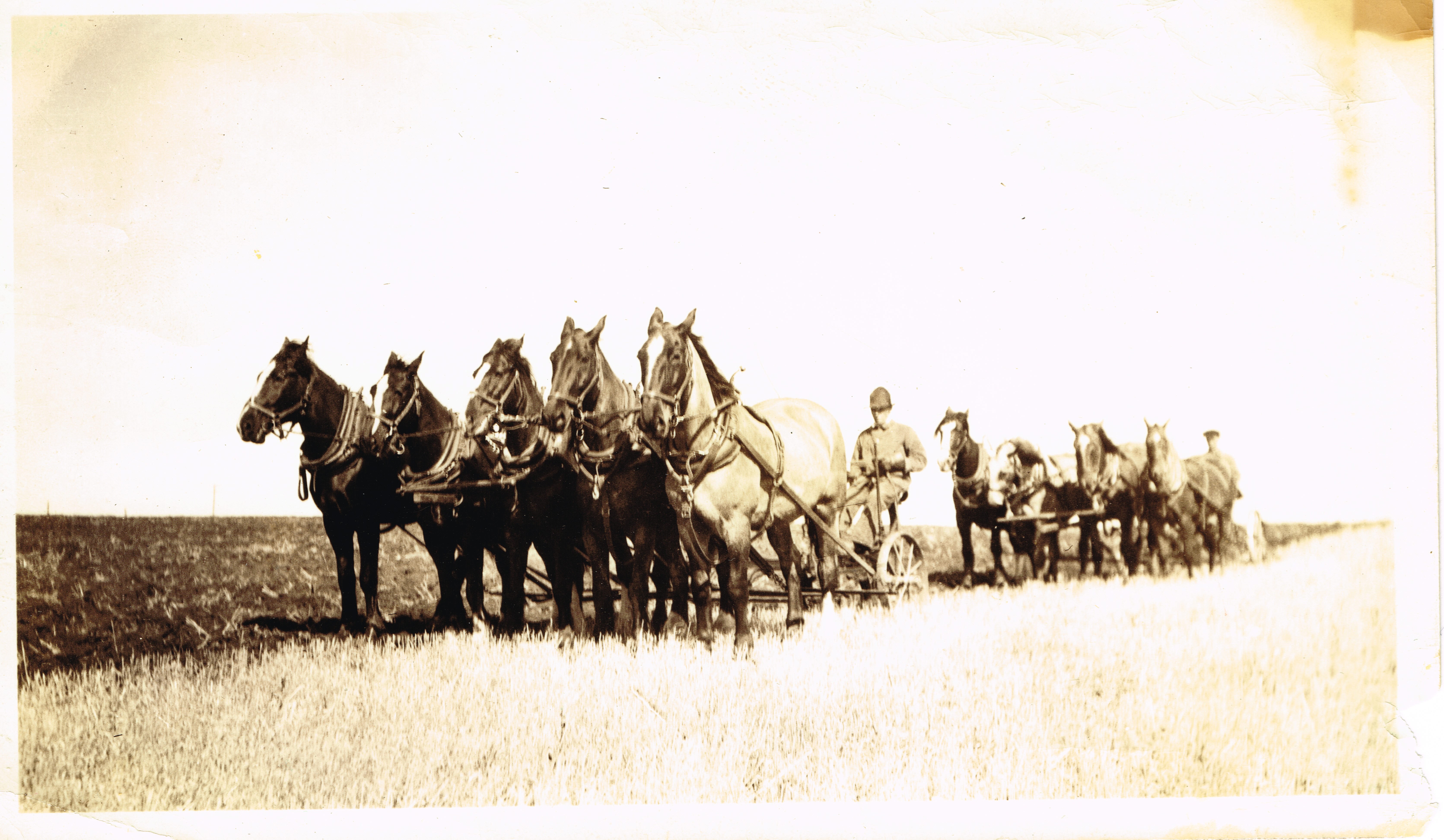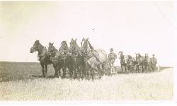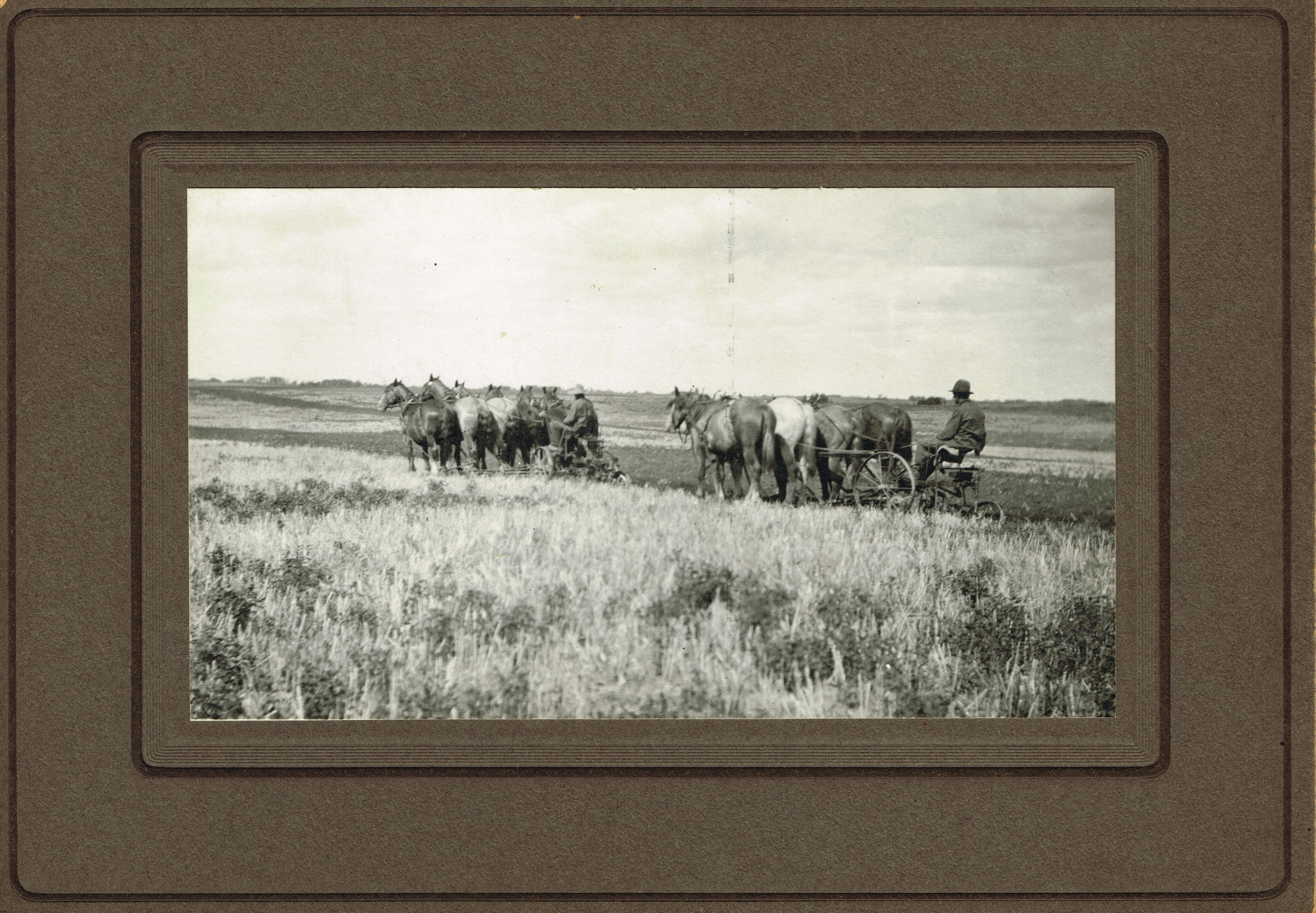 Description Plowing with 2 + 3 furrow gang ploughs on John F. McTavish farm sec. 17-16-21
