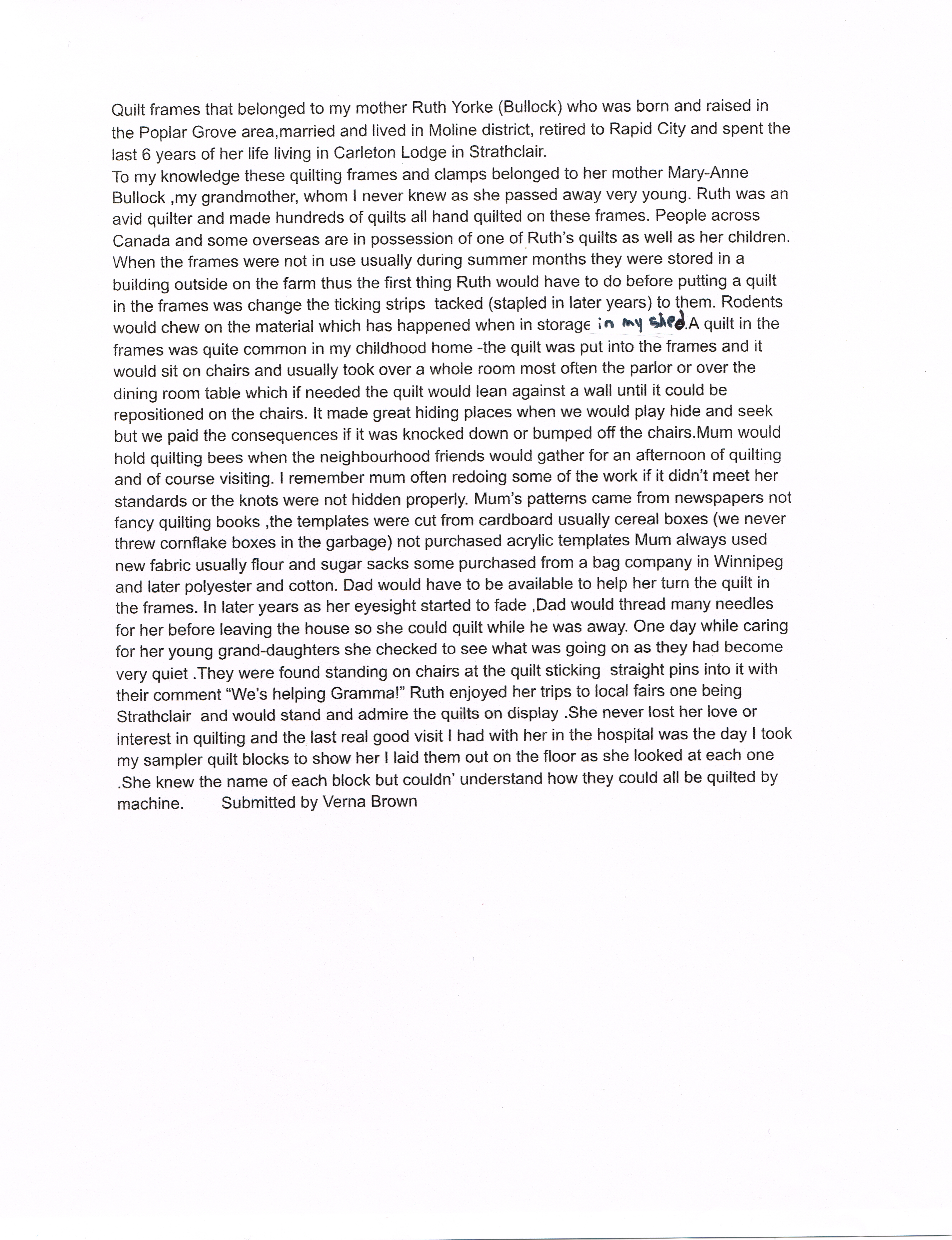 Object Desc The quilt top which was never quilted, made by Ruth Yorke (Mother of Verna Brown) She made this when in her late 70s, with her eyesight being very poor by then.
