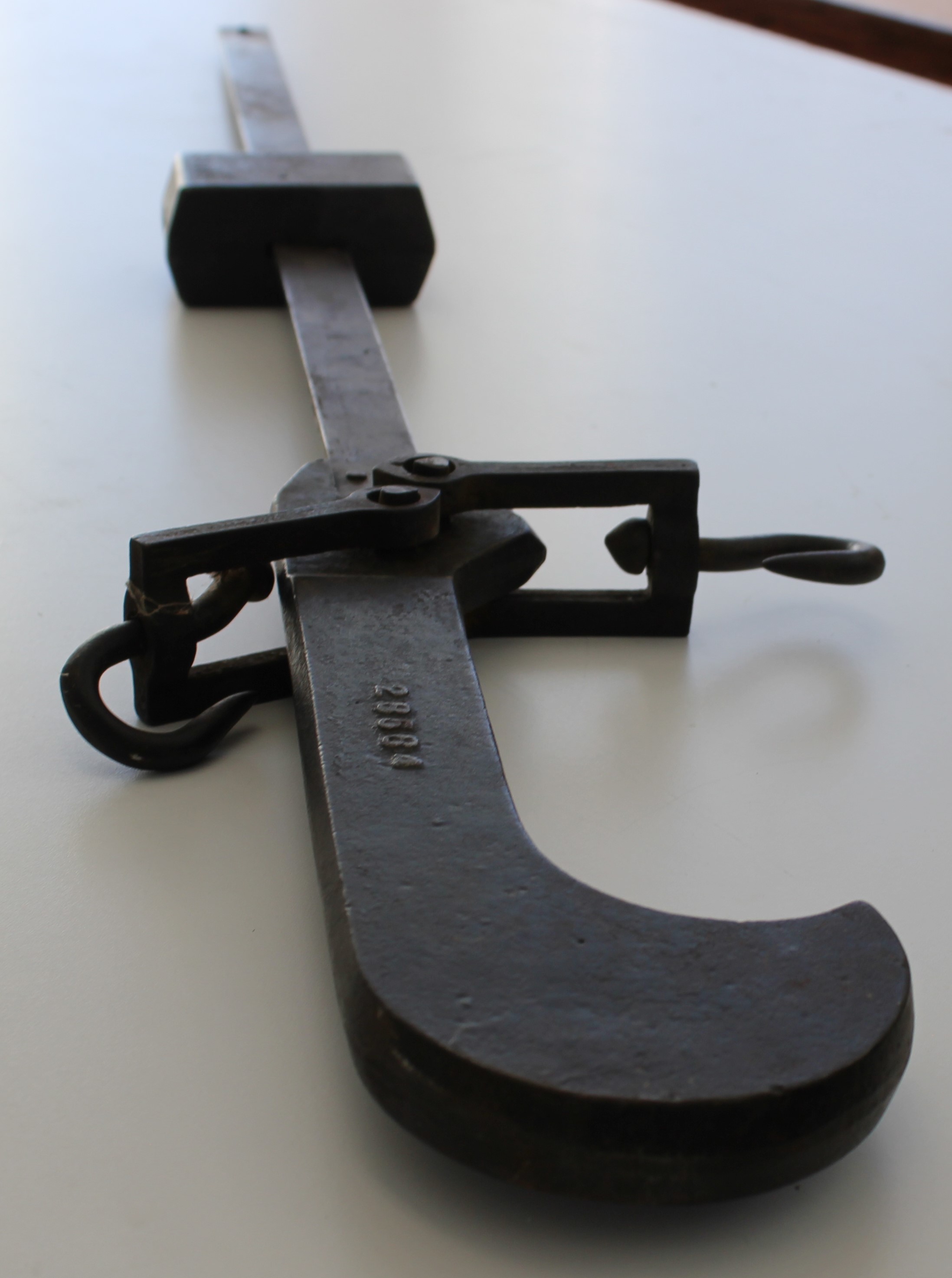 Object Desc Agricultural tool, owned by Jack Coe who farmed opposit Jim Mackie until Jack died. This along with sets of counter balance weights would have been used to weigh sacks of grain when graim was handled that way.