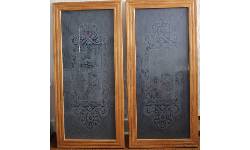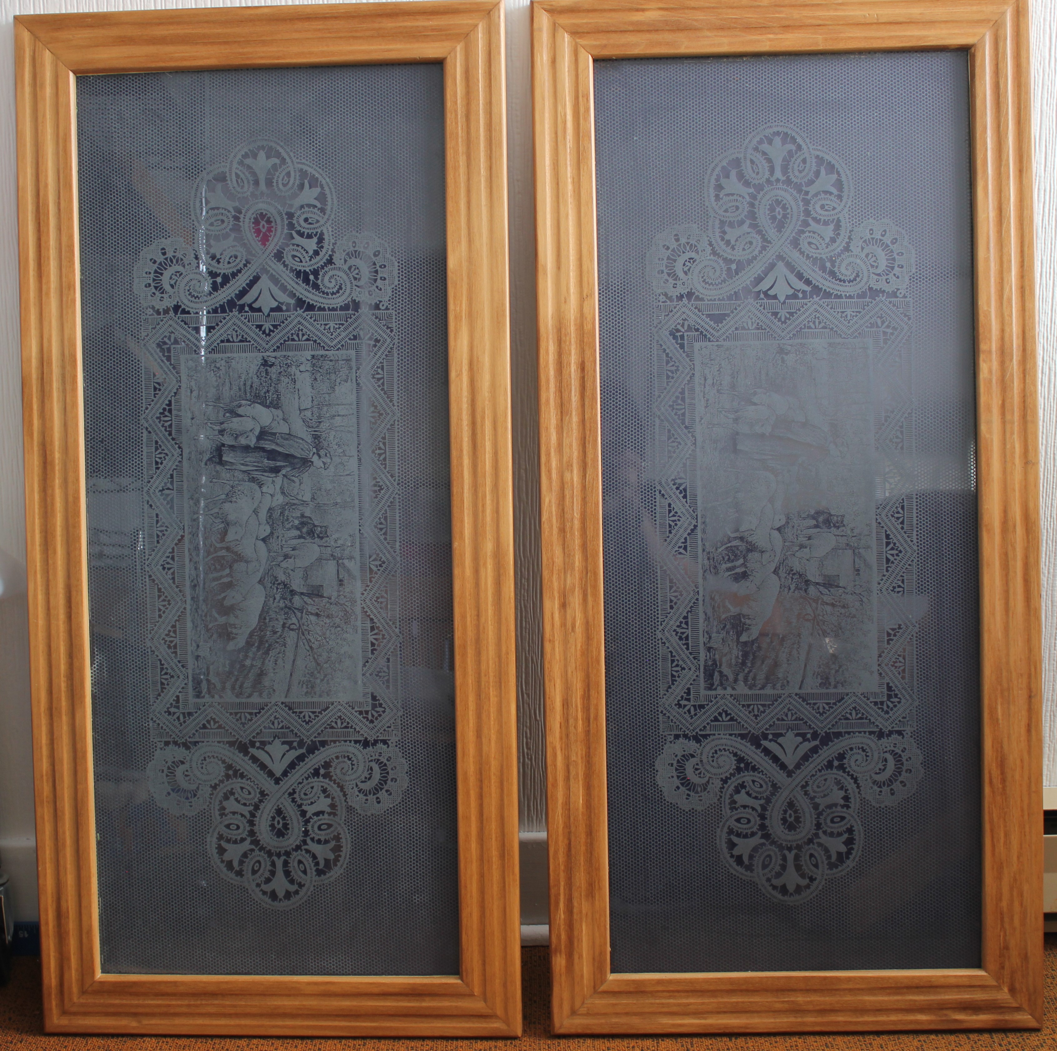Object Desc 2 acid-etched, framed windows donated by Donna Mackie. Their origins trace back to 1916 with the Morrison family. Refer to notes.