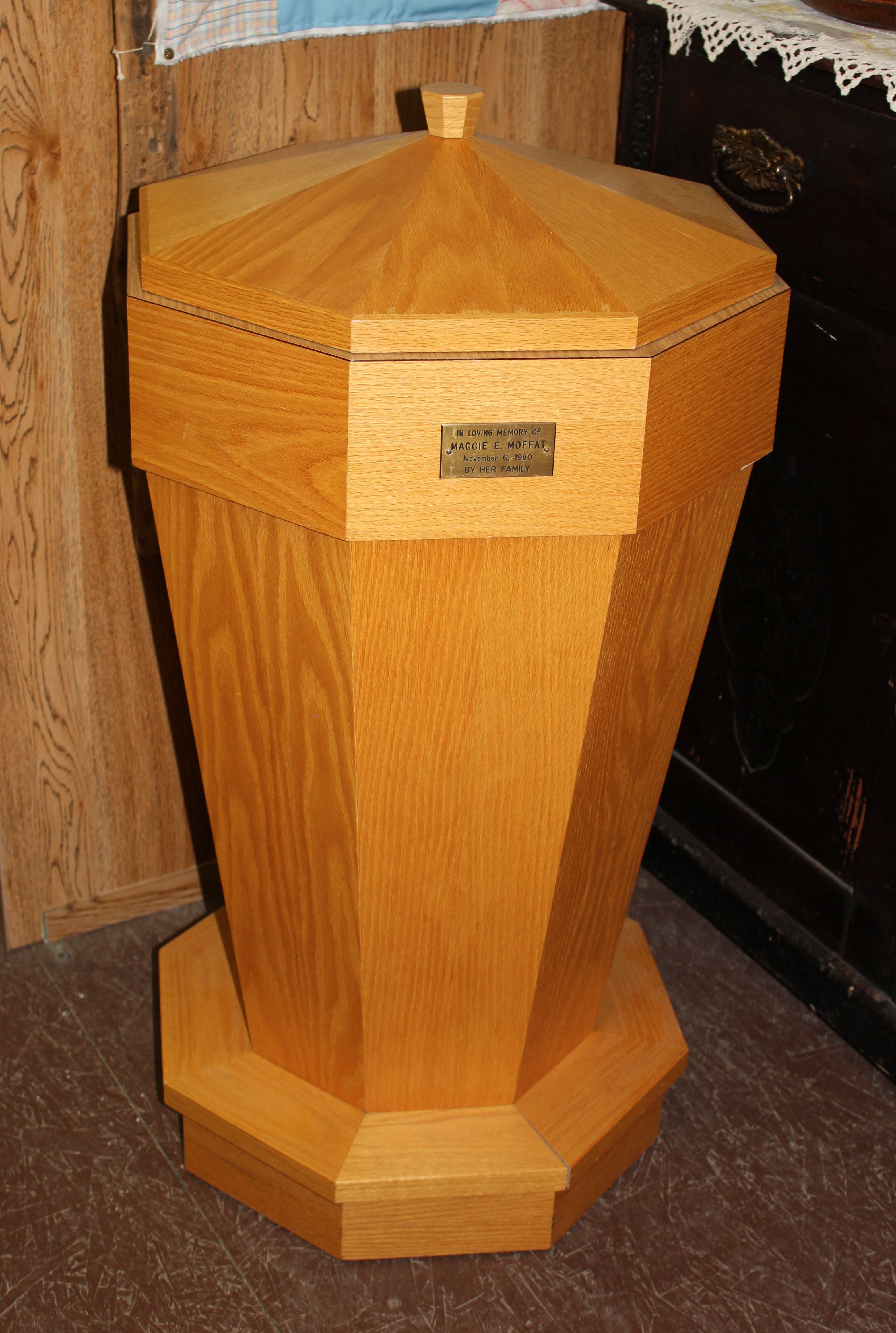 Object Desc Baptisimal Font. Donated in memory of Maggie E Moffat (Mother of Tom Moffat) Nov 6. 1980 by her family