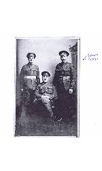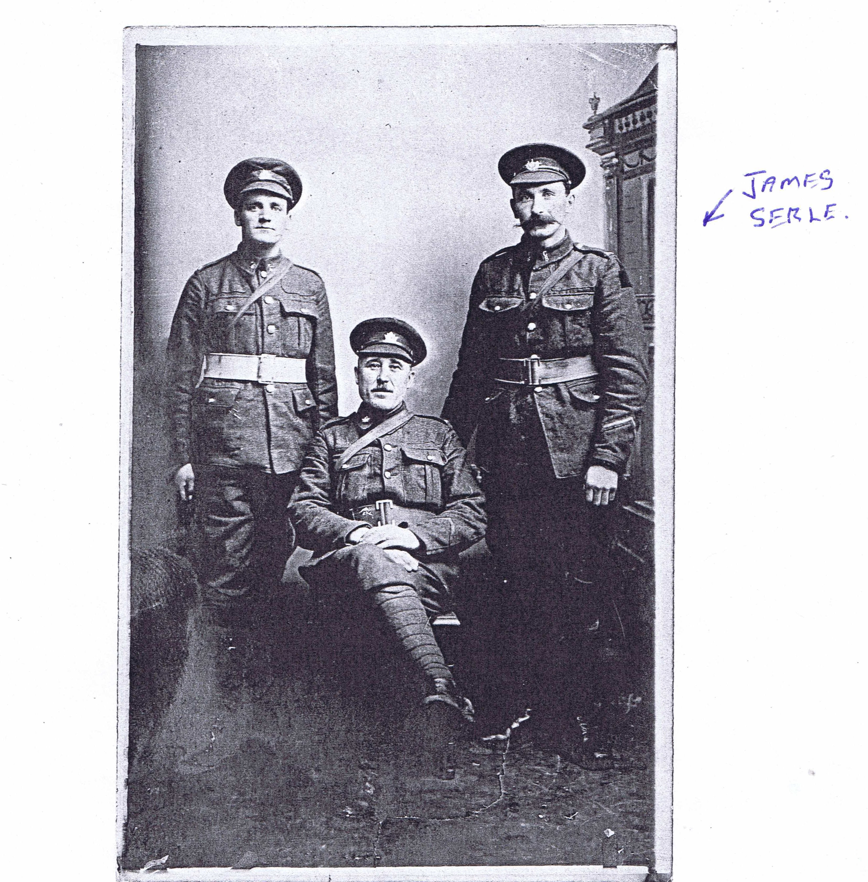 Object Desc Picture of three soldiers including Jim Serle (on the right) 1918. Maud Bull, 2nd wife of George Bull (no children) George is father to Edward Bull, grandfather and step grandmother ot Earl, Lloyd, Howard, Larry, Don, Ken and Bob. Jan 27, 1918